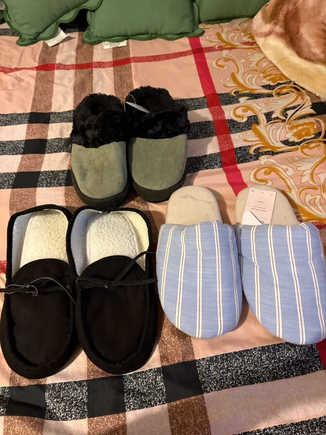 Here are some assorted slippers. There are three different pairs in different styles and colors. They appear to be in good condition.