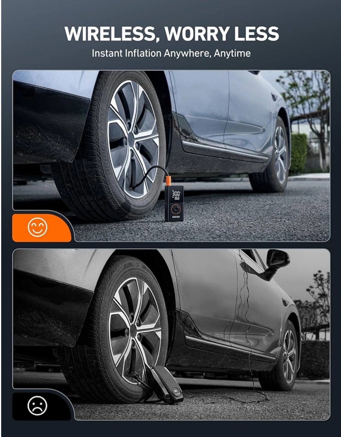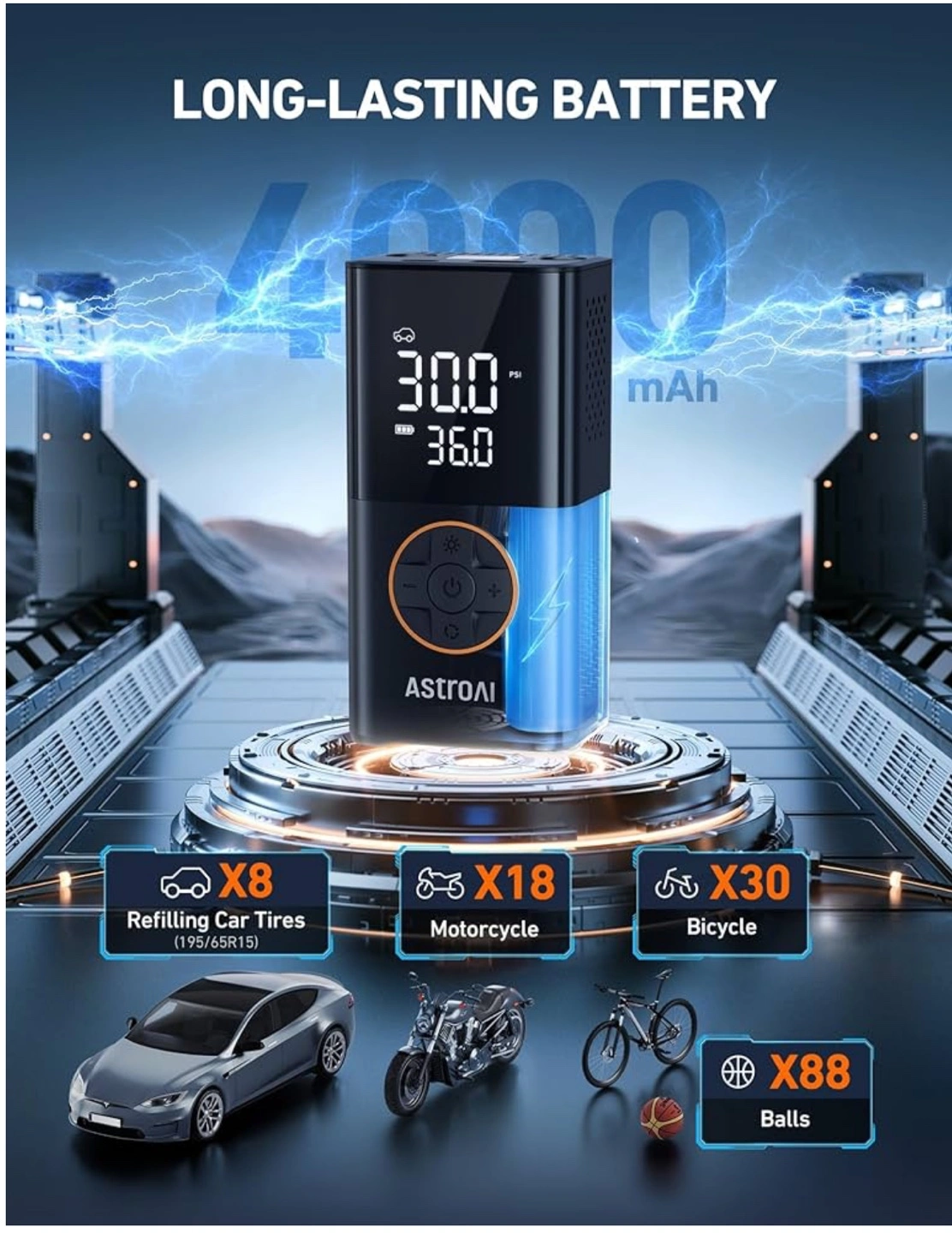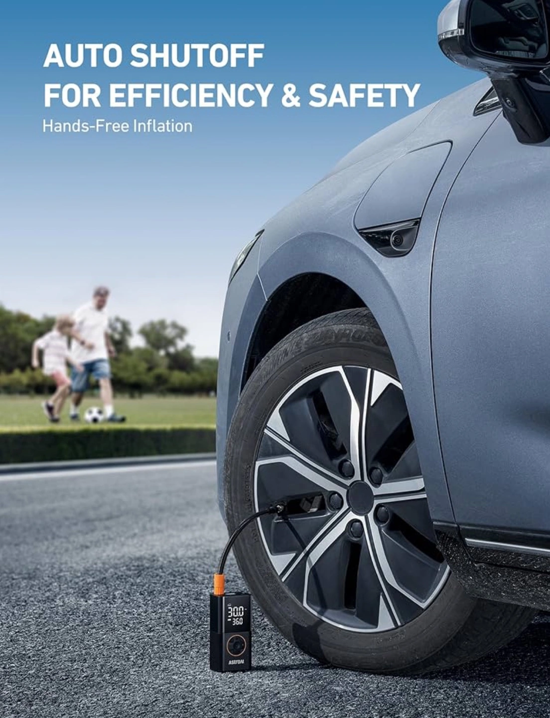 Portable and cordless air pump. Inflates car, motorcycle, bicycle tires, and more. Digital display shows PSI. Includes various nozzle attachments. Auto shutoff feature.