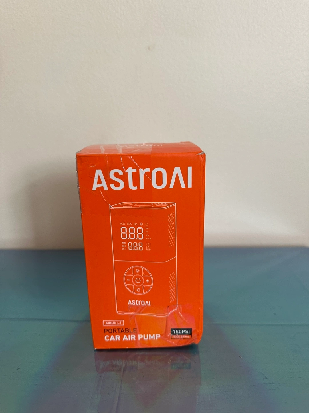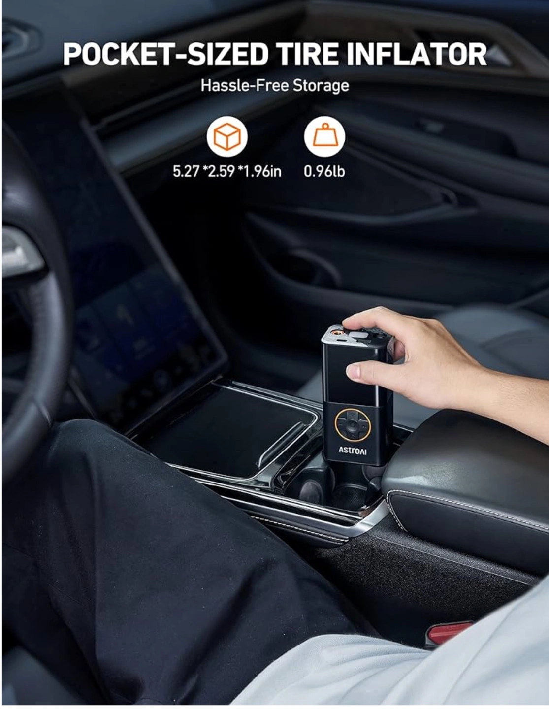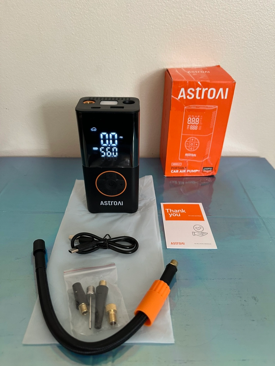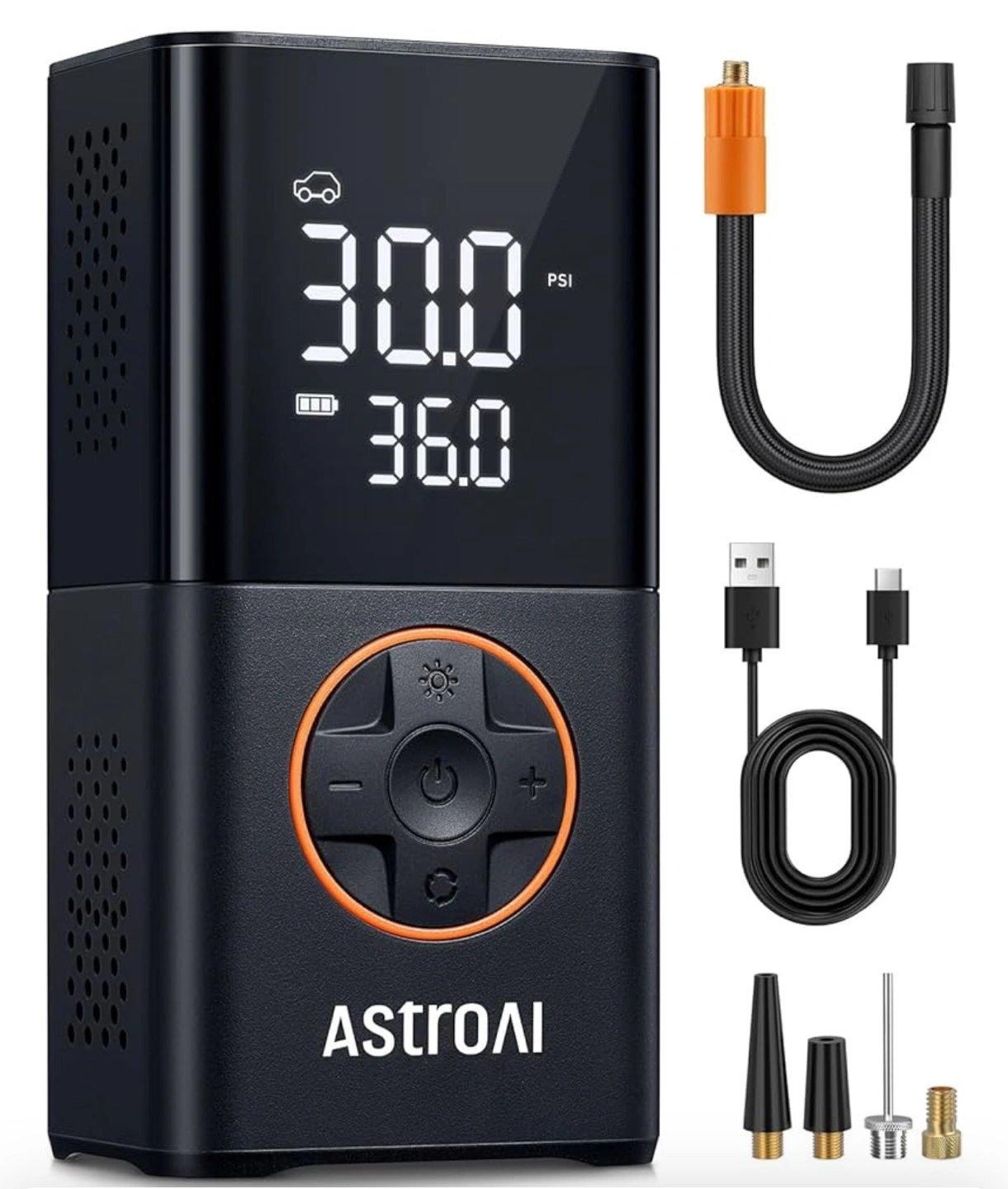 Portable and cordless air pump. Inflates car, motorcycle, bicycle tires, and more. Digital display shows PSI. Includes various nozzle attachments. Auto shutoff feature.