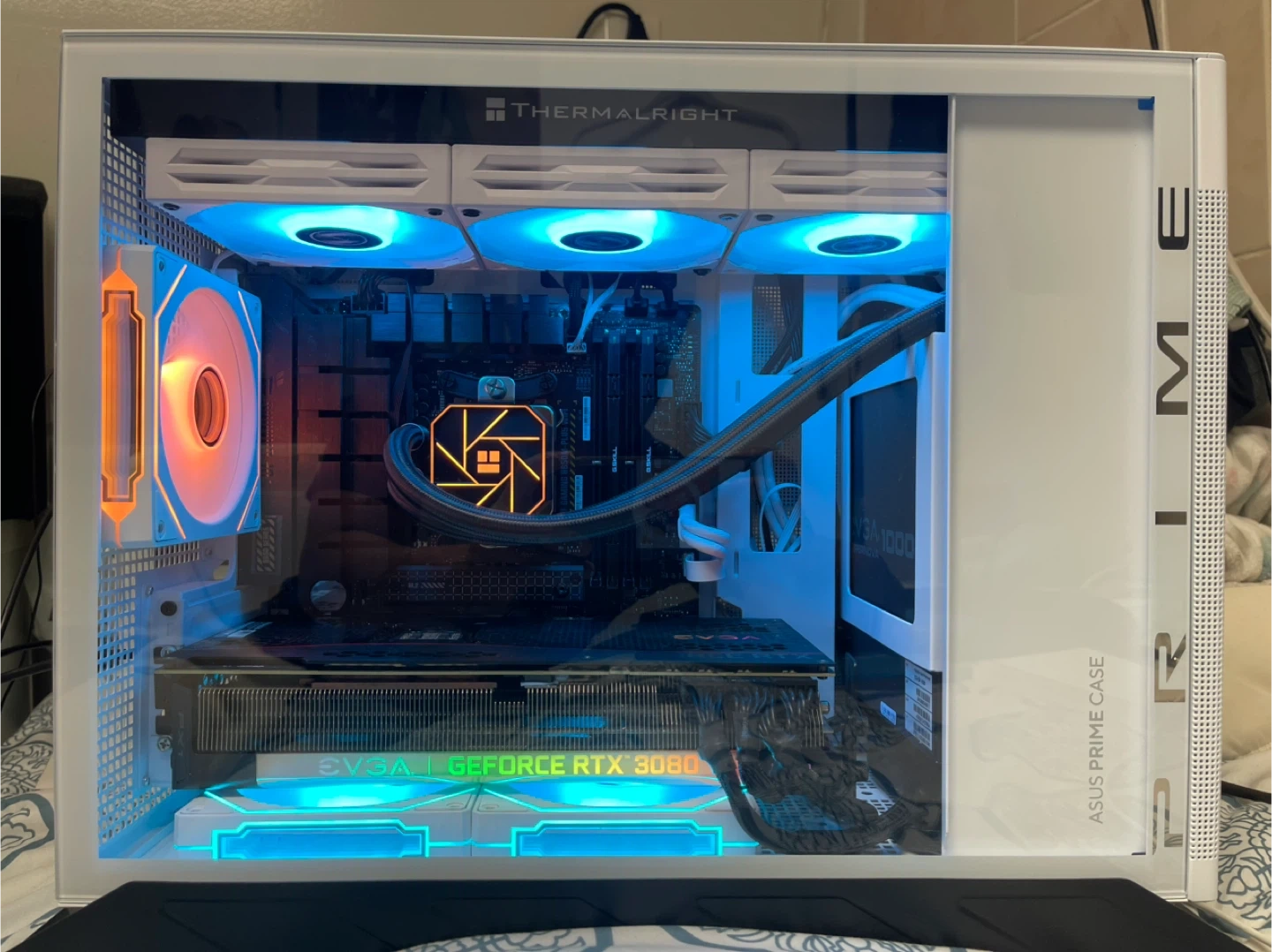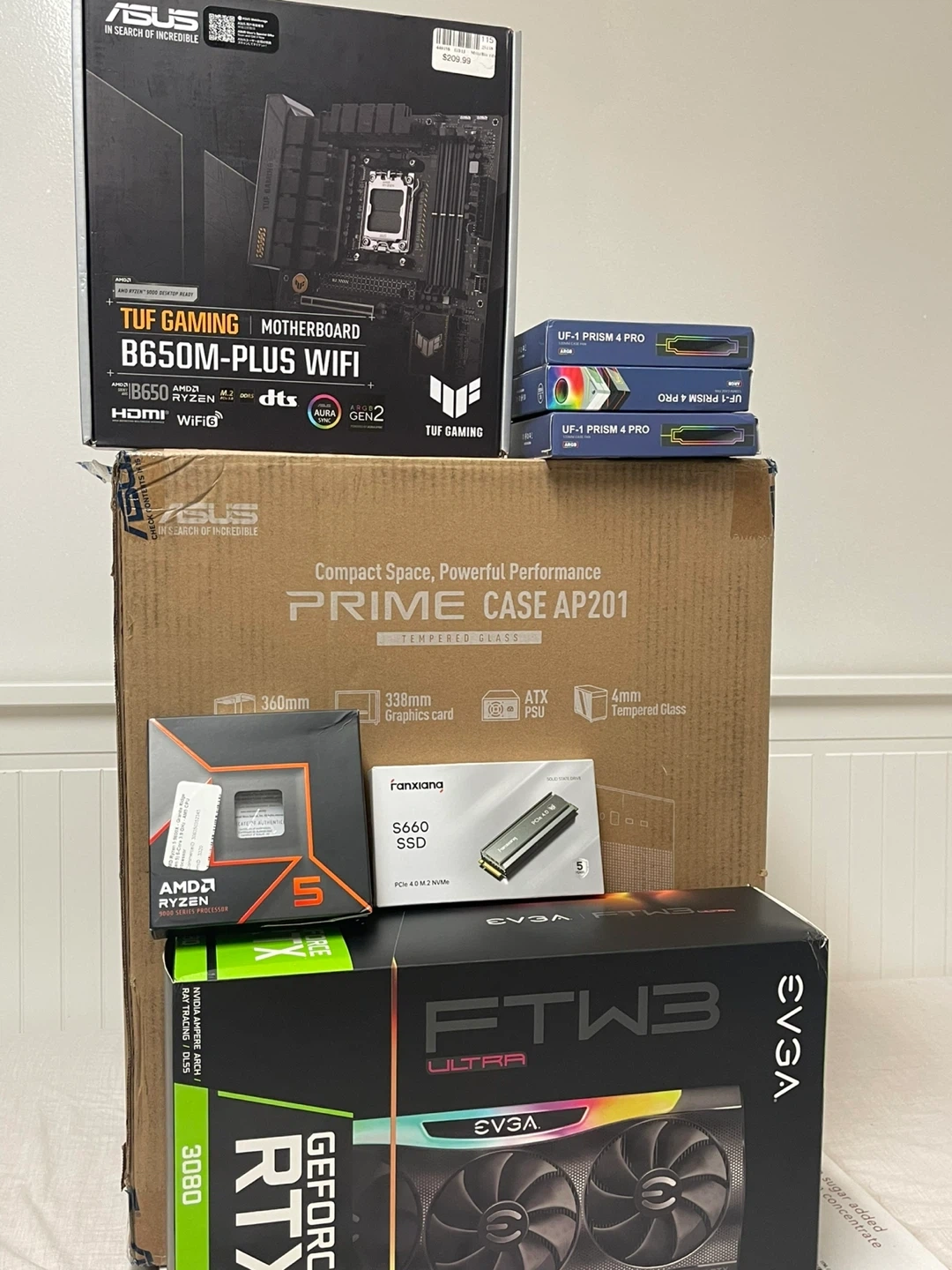 15ASUS AM5 MicroATX Custom Gaming Case: Asus Prime AP201 MicroATX Motherboard: Asus TUF B650M Gaming Wifi RAM: 32GB FlareX5 6000mhz CPU: AMD 9600X 9000series GPU: EVGA 3080 FTW 10GB RGB SSD: 1TB Inland SSD AIO: Aqua Elite 360mm Thermalite ARGB PSU: EVGA 1000GQ Fully Modular (1000w) System fans: Dual Prism ARGB daisy chaino Note: only antenna and power cable are included. No scratches on the glass and metal panels. All ports are functional and working.
