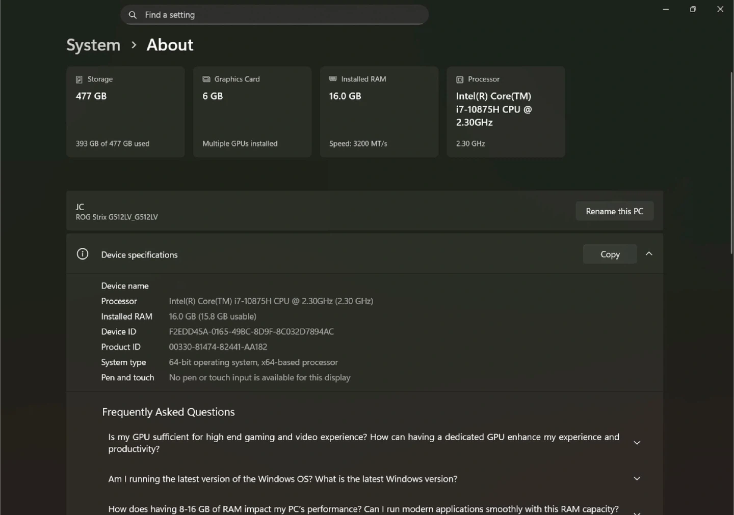 60Full working condition Intel i7 processor RTX 2060 6GB 16GB RAM 512GB SSD Easily supports most games (GTA V, Fortnite, Apex Legends, COD etc) Comes with charger and cable Pickup at Washington Heights More info here: https://www.amazon.com/ASUS-Display-i7-10750H-Keyboard-G512LV-ES74/dp/B0865JLXGG