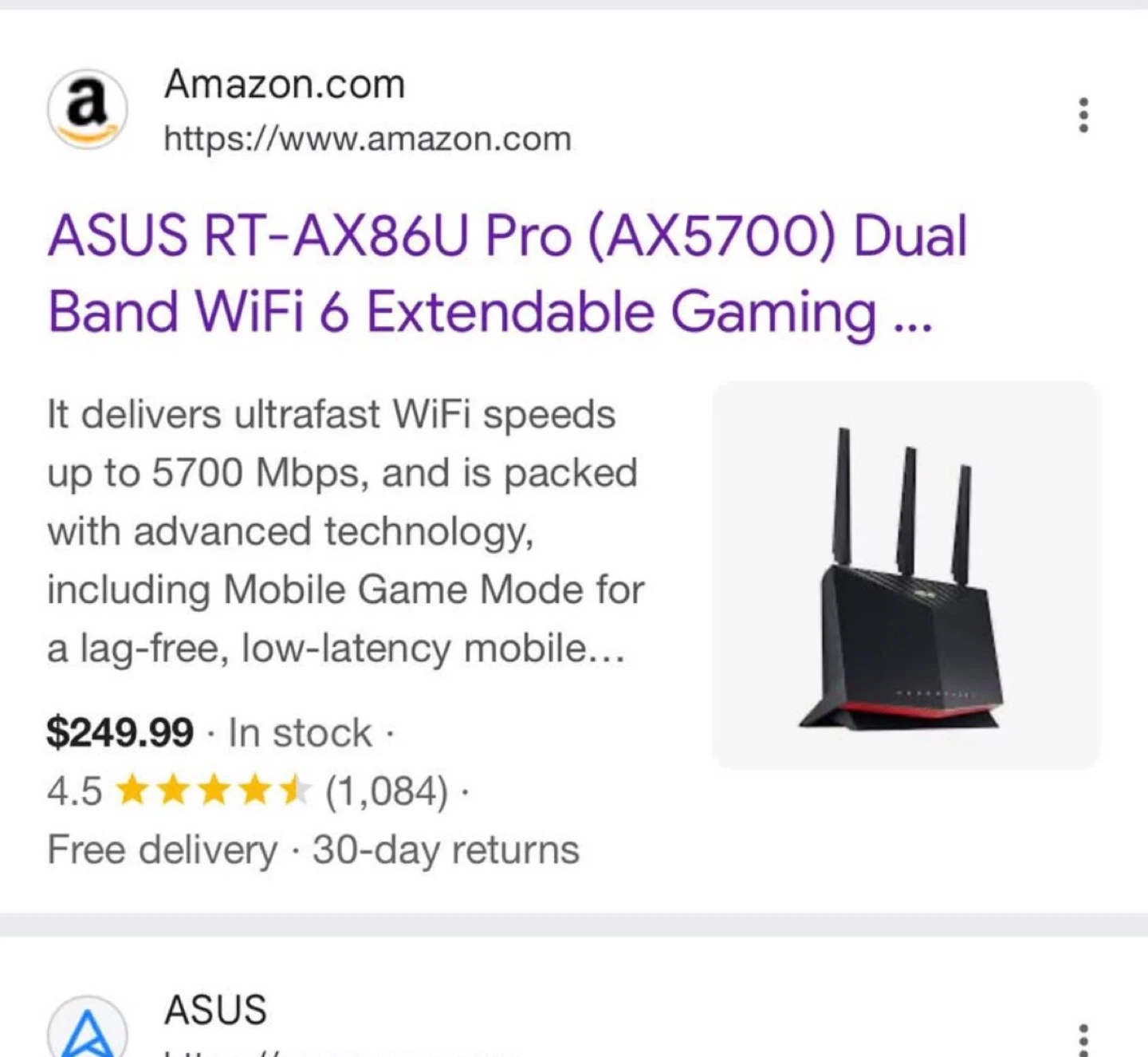 5Selling an ASUS RT-AX86U Pro (AX5700) Dual Band WiFi 6 Extendable Gaming Router. It delivers ultrafast WiFi speeds up to 5700 Mbps and is packed with advanced technology, including Mobile Game Mode for a lag-free, low-latency mobile experience. Comes with the power adapter Retail $249