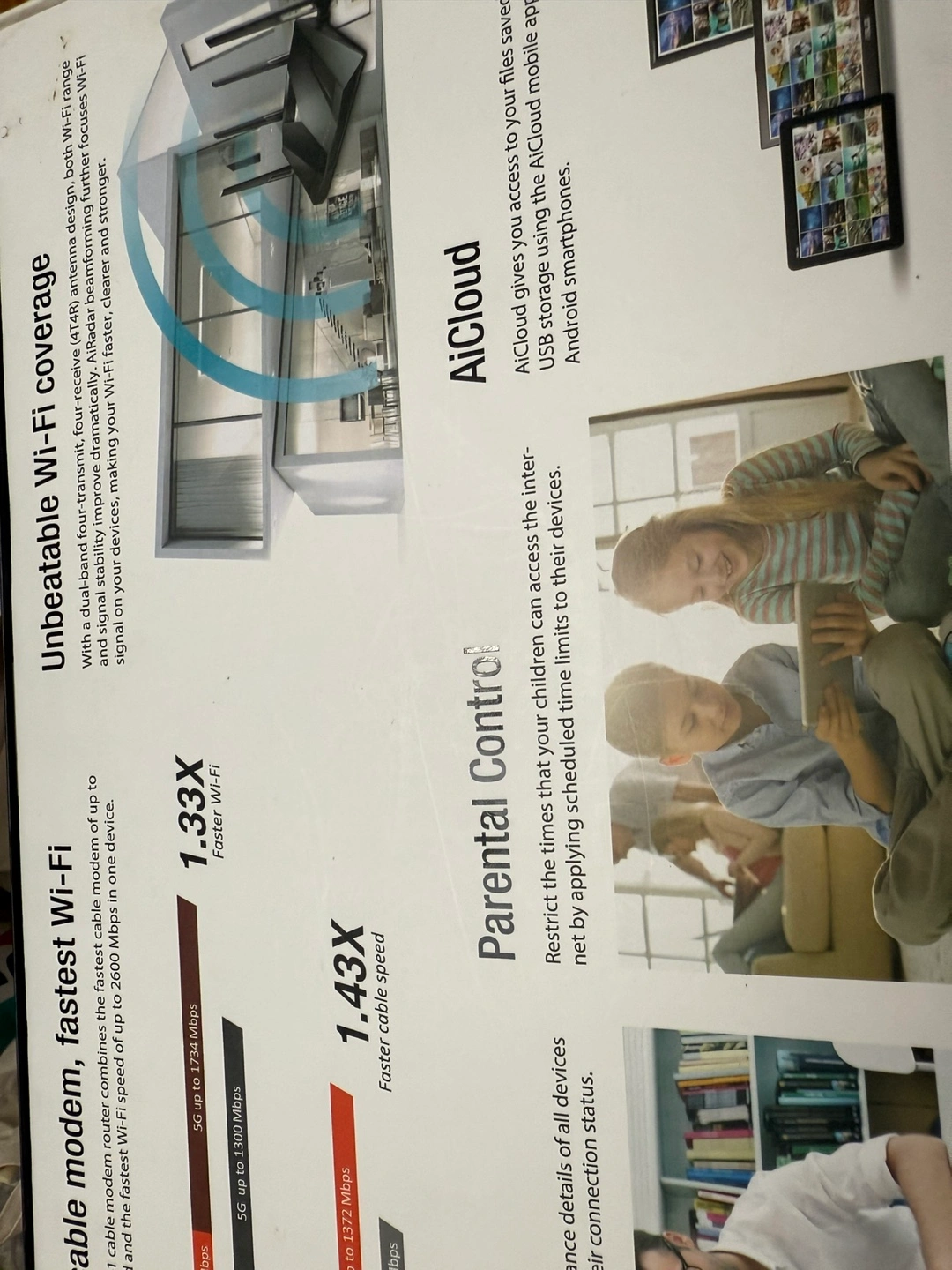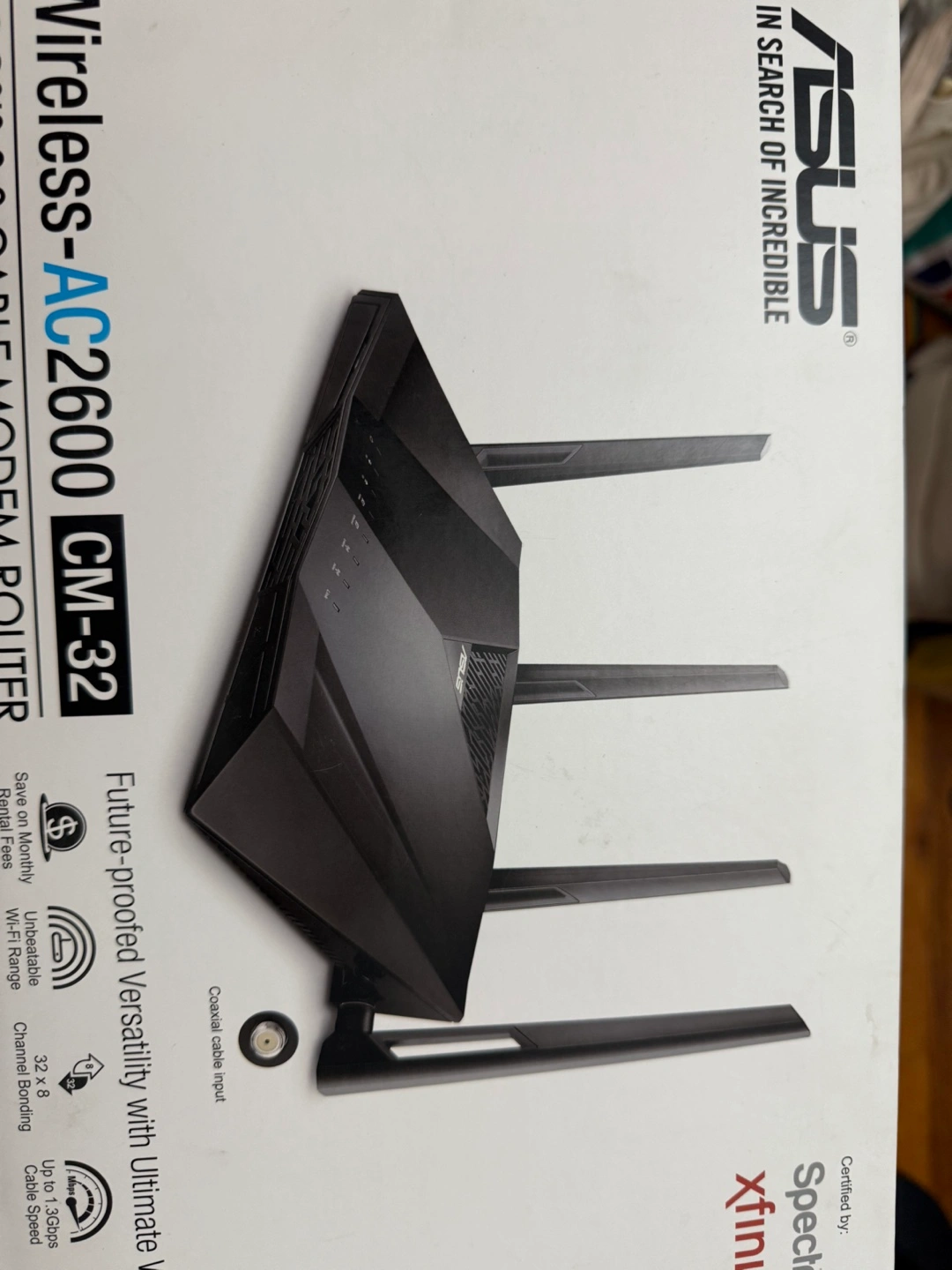 Selling an ASUS Wireless-AC2600 CM-32 DOCSIS 3.0 cable modem router. It combines the fastest cable modem with dual-band Wi-Fi. It also has AiRadar beamforming for clearer and stronger Wi-Fi signals. It has parental controls and AiCloud, which gives you access to your files saved on USB storage using the AiCloud mobile app for Android smartphones.