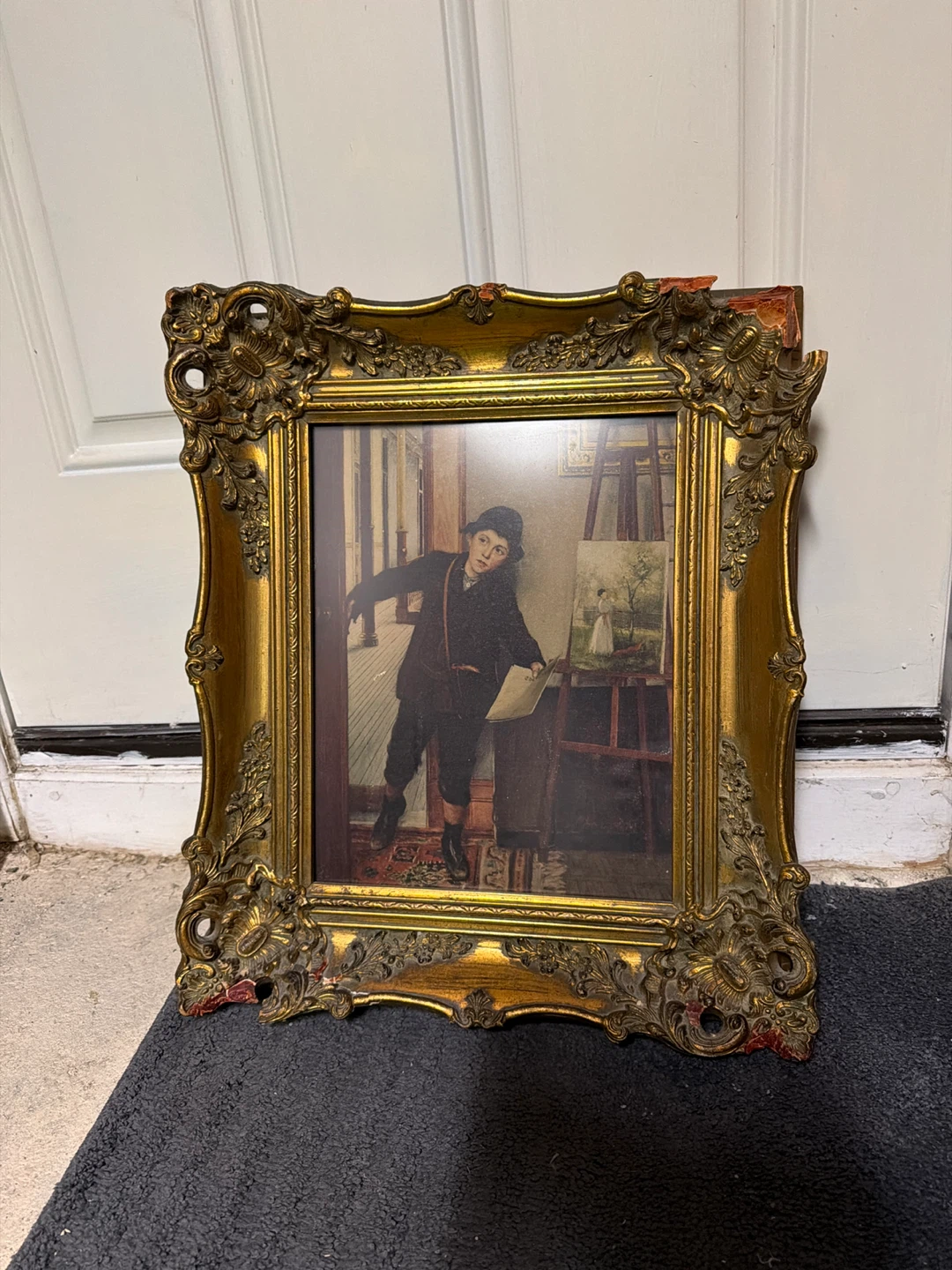 Vintage framed painting of a young boy. It's presented in a highly ornate gold-colored frame with decorative detailing. The frame shows some wear and minor damage on the corners. This piece would add a classic touch to any decor.