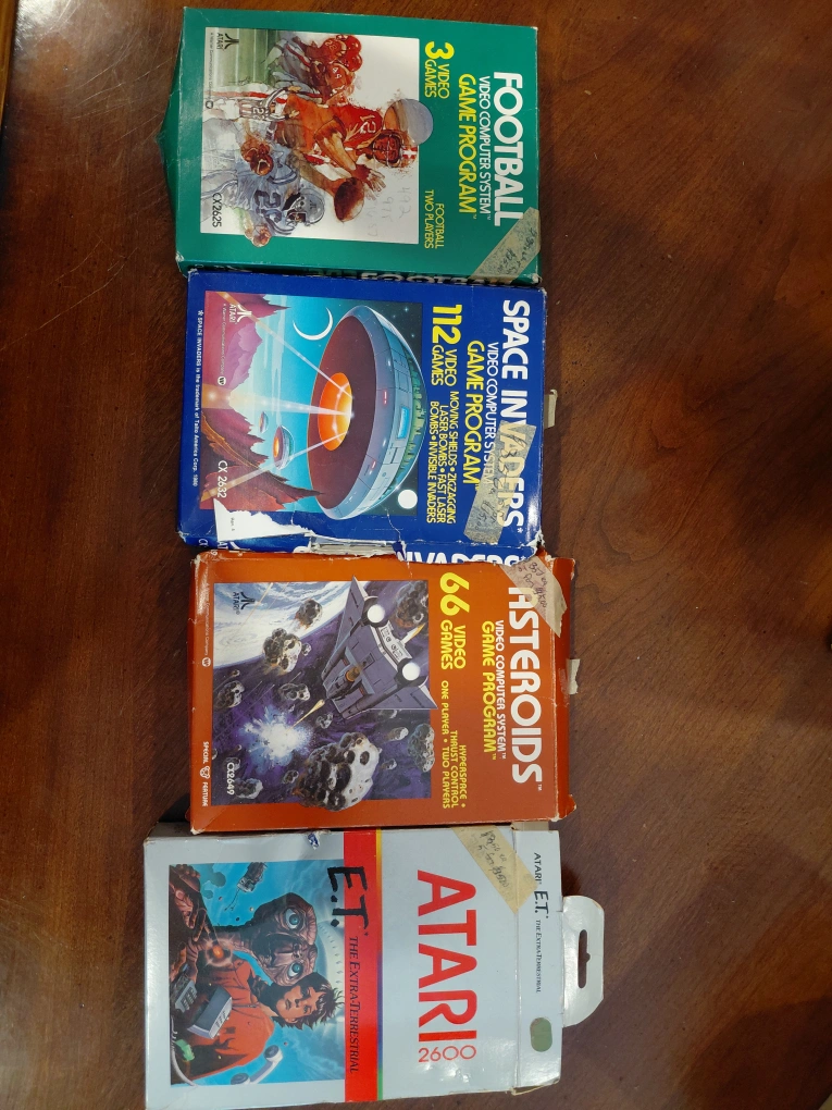 Selling a collection of classic Atari video games! Includes Football, Space Invaders, Asteroids, and E.T. for the Atari 2600. Great for collectors or anyone looking to relive some retro gaming fun