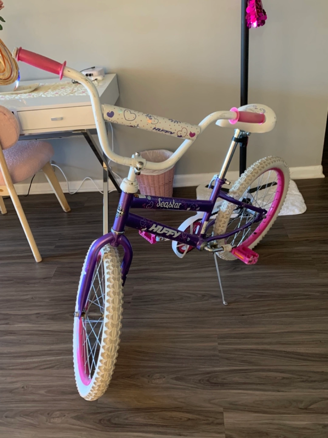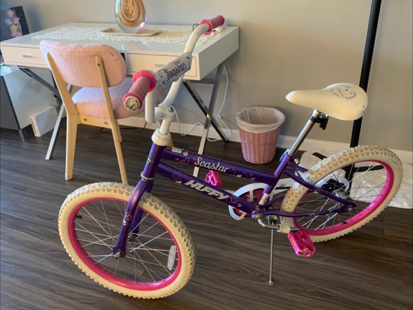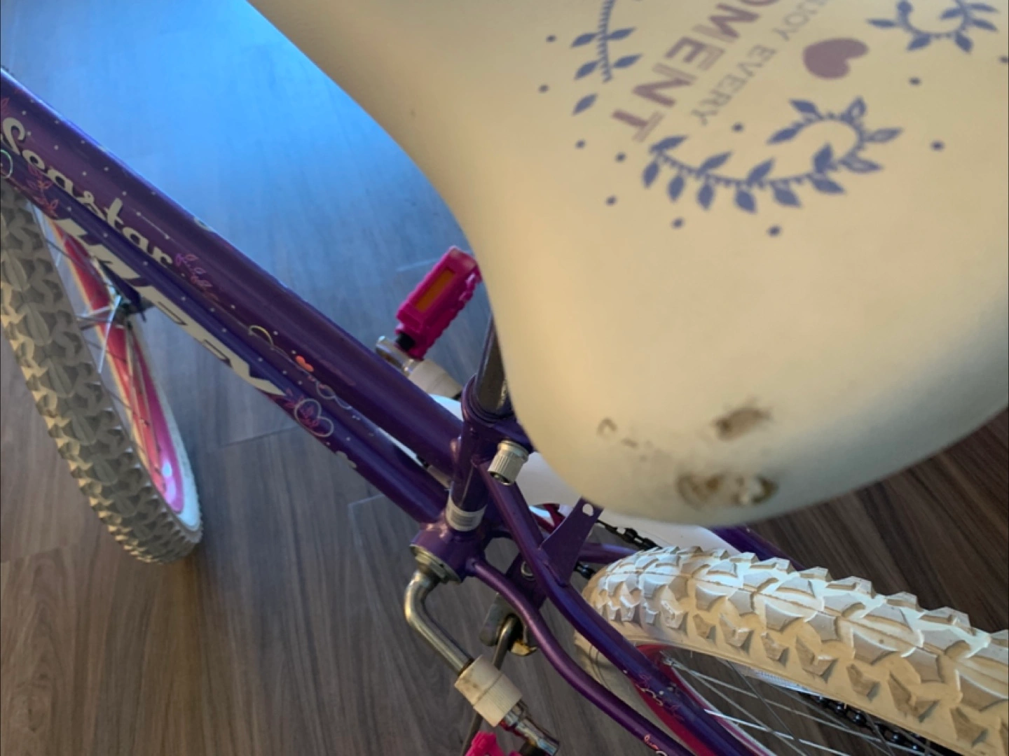 Giving away for free a cute (it’s a 20” I believe) Huffy Seastar girls bike in purple and pink! It's perfect for a young rider. The bike has some wear and tear, but it's still in good working condition. Tires are great and inflated. Streamers missing. No training wheels. $98 at Walmart. See wear sections in pictures.