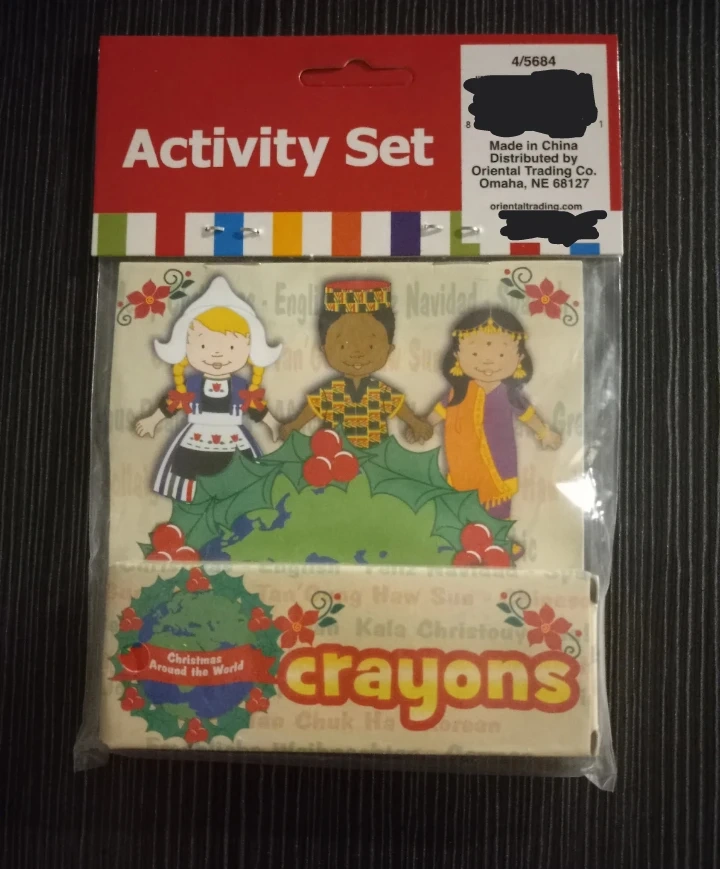 This activity set includes a Christmas Around the World activity book and a box of crayons. It's designed for kids to learn about holiday traditions globally. Includes various paper crafts and coloring pages!