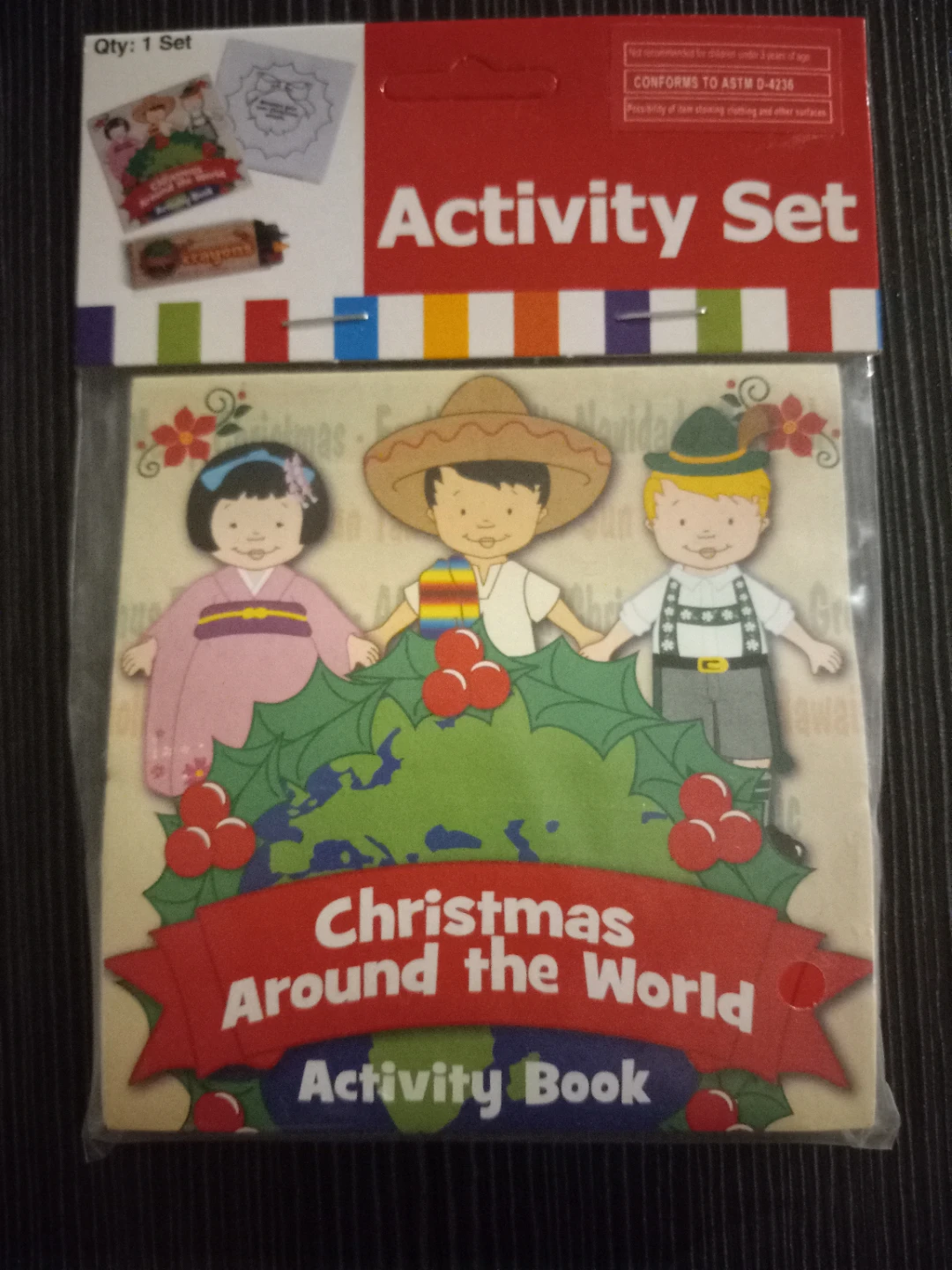 This activity set includes a Christmas Around the World activity book and a box of crayons. It's designed for kids to learn about holiday traditions globally. Includes various paper crafts and coloring pages!