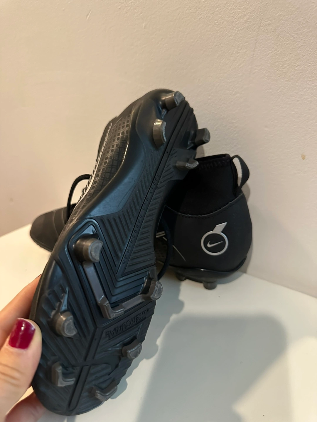 Black and silver soccer cleats with molded studs. Engineered for speed.