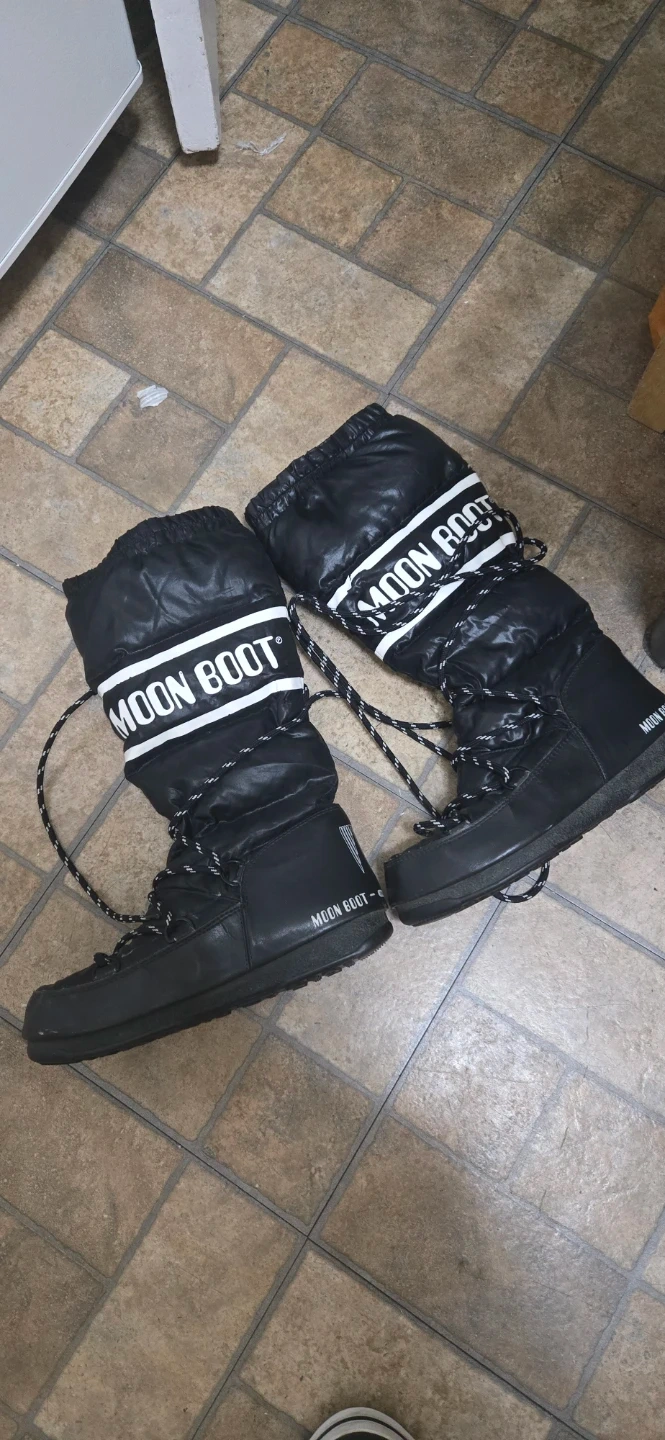 Selling a pair of black Moon Boots. These boots are perfect for winter weather and are in good condition. They feature the classic Moon Boot design and are sure to keep your feet warm and dry during snowy days