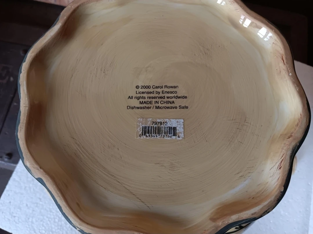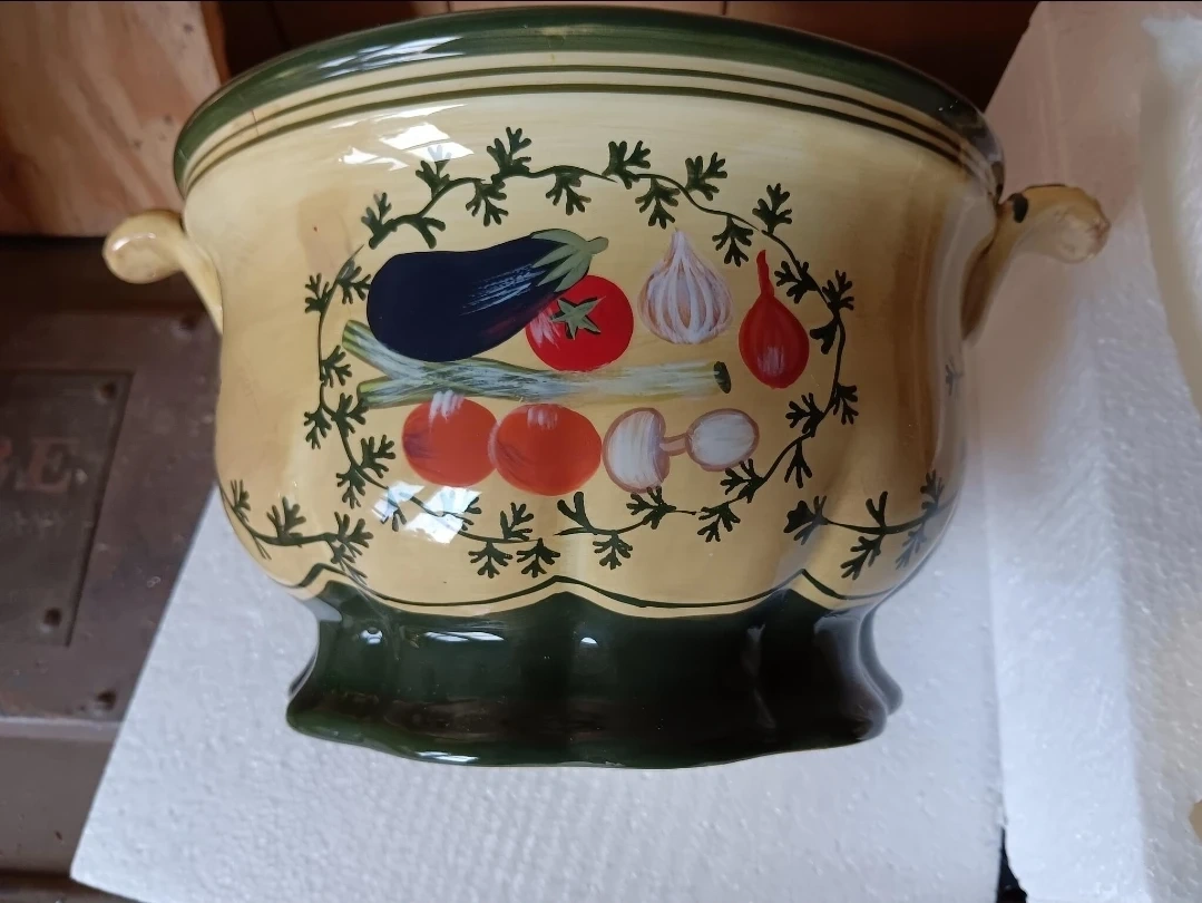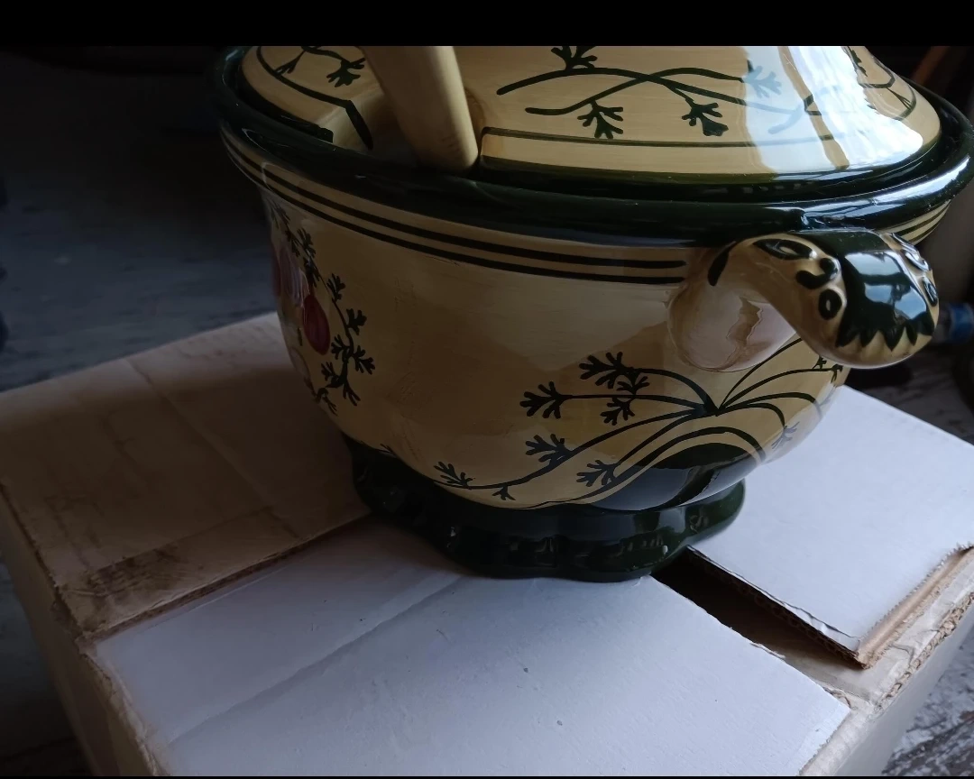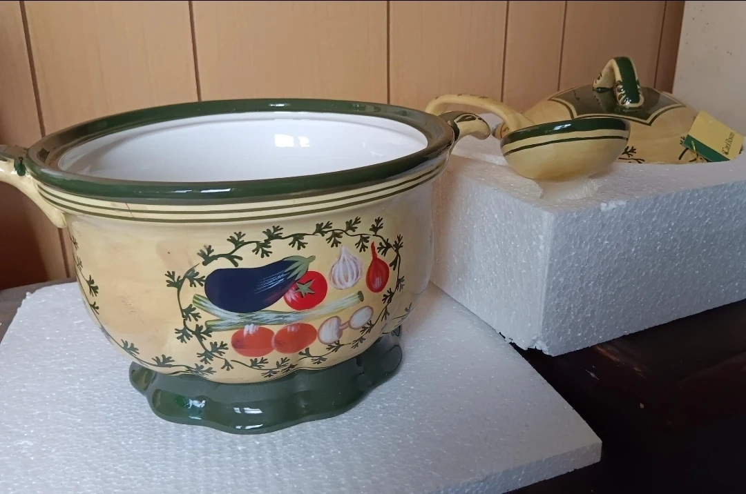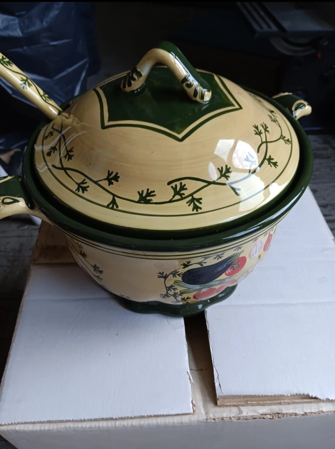 Selling a beautiful Carol Rowan ceramic soup tureen with a matching ladle! This charming piece features a lovely design with vegetable motifs and comes with its original box