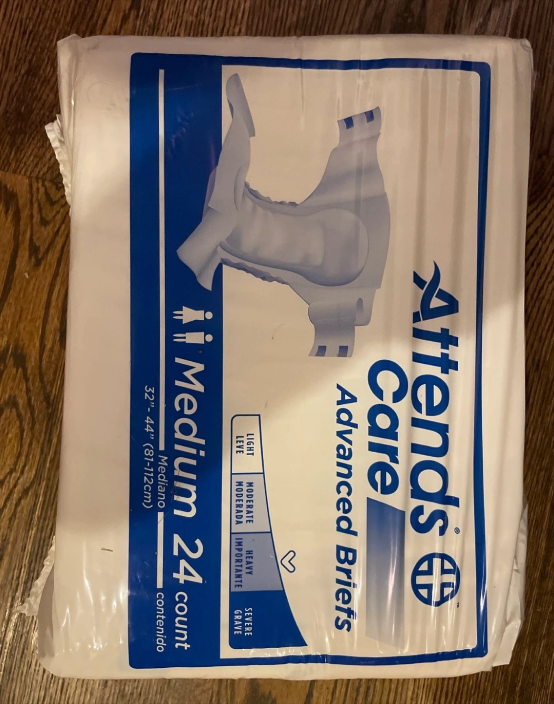 New, unopened package of Attends Care Advanced Briefs. Medium size, 24 count. Absorbency levels indicated on packaging.