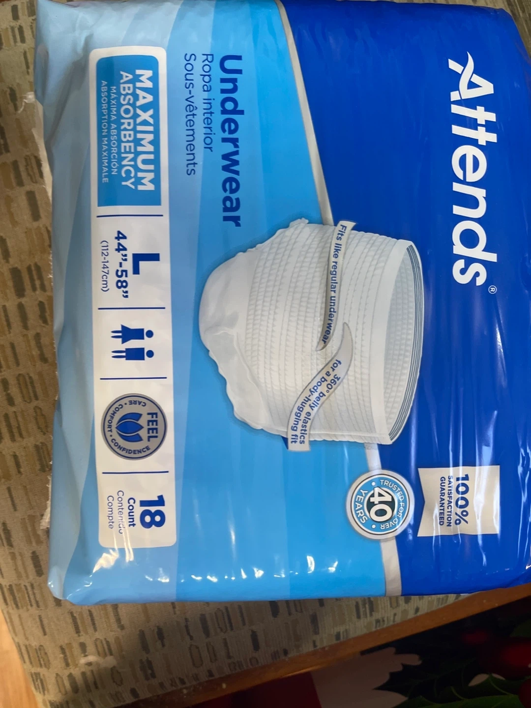 Selling a pack of Attends Underwear in size L (44-58 inches). The pack contains 18 count. These are designed for maximum absorbency and fit like regular underwear with 360° belly elastics for a body-hugging fit