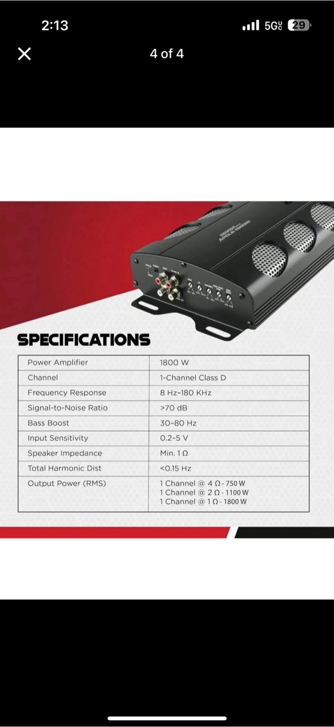 Selling an AudioPipe subwoofer and amplifier combo! The amplifier is 1800W with a 1-Channel Class D. It has a frequency response of 8 Hz-180 KHz and a signal-to-noise ratio of >70 dB. Bass boost is 30-80 Hz. Great sound!
