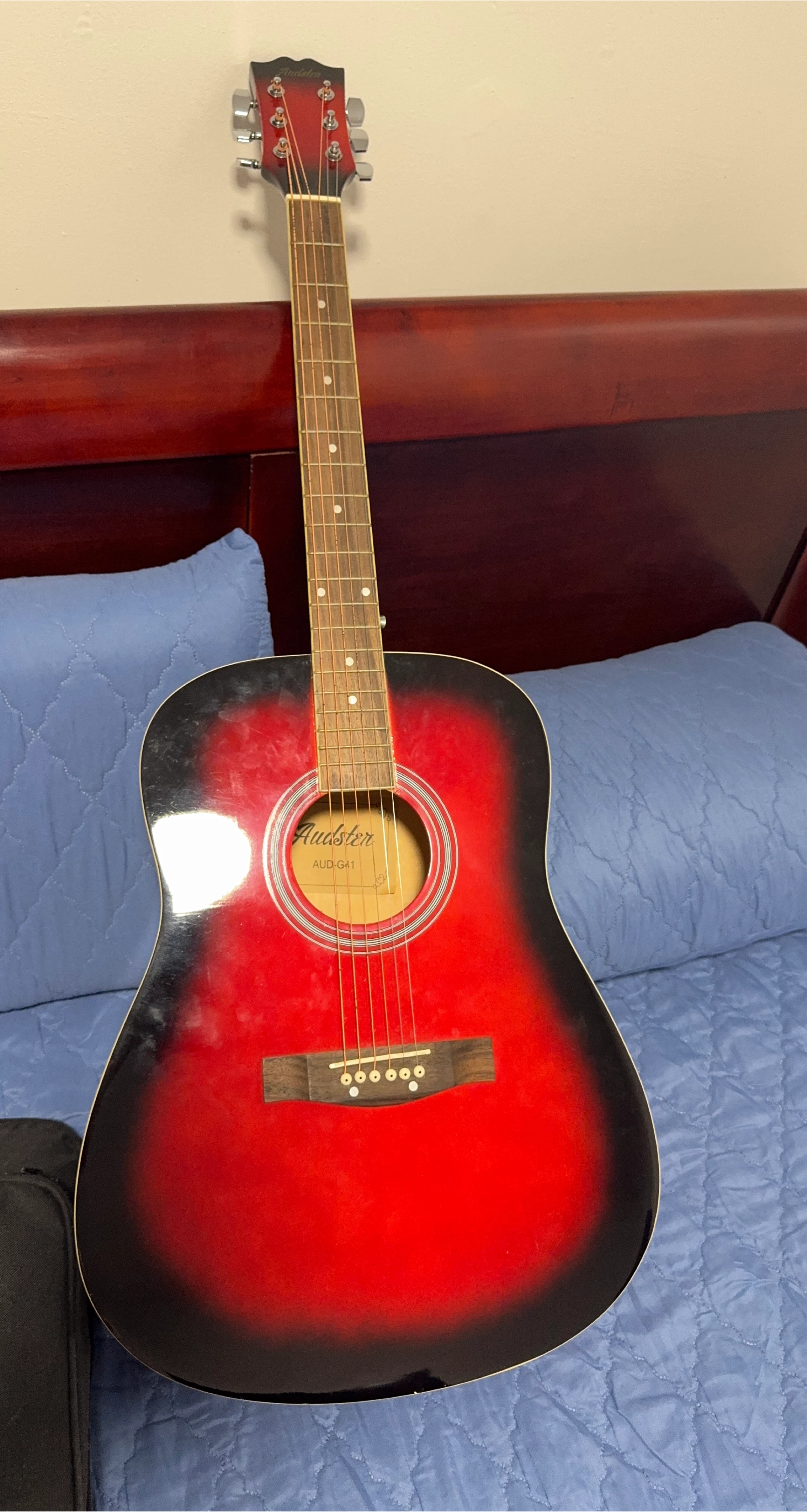 Selling an Audster AUD-G41 acoustic guitar in a vibrant red color! It's a great instrument for beginners or anyone looking for a fun guitar to play. It's in good condition and ready to make some music
