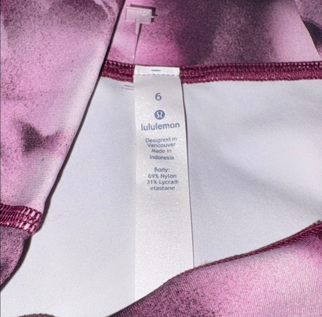 Lululemon Align leggings in a size 6. They feature a purple floral print design. Made with 69% Nylon and 31% Lycra elastane for a comfortable fit. Perfect for yoga or everyday wear!