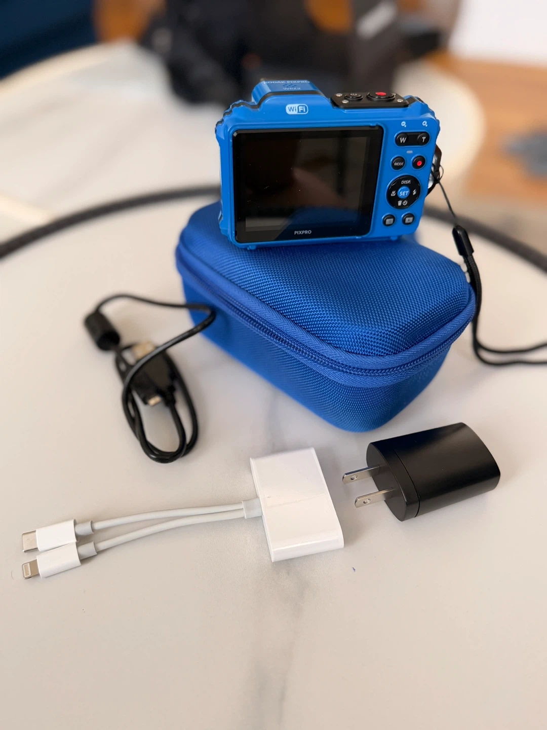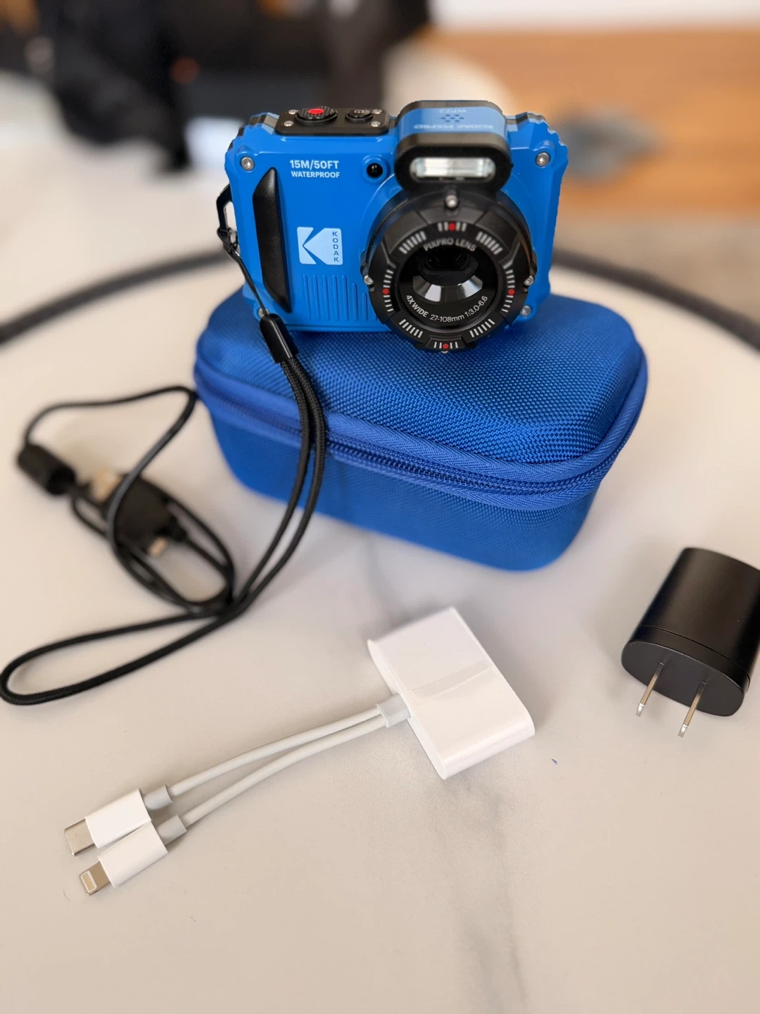 Blue Kodak PIXPRO waterproof digital camera. It's 15m/50ft waterproof. Comes with a blue protective case, USB cable, and power adapter. Great for outdoor adventures!