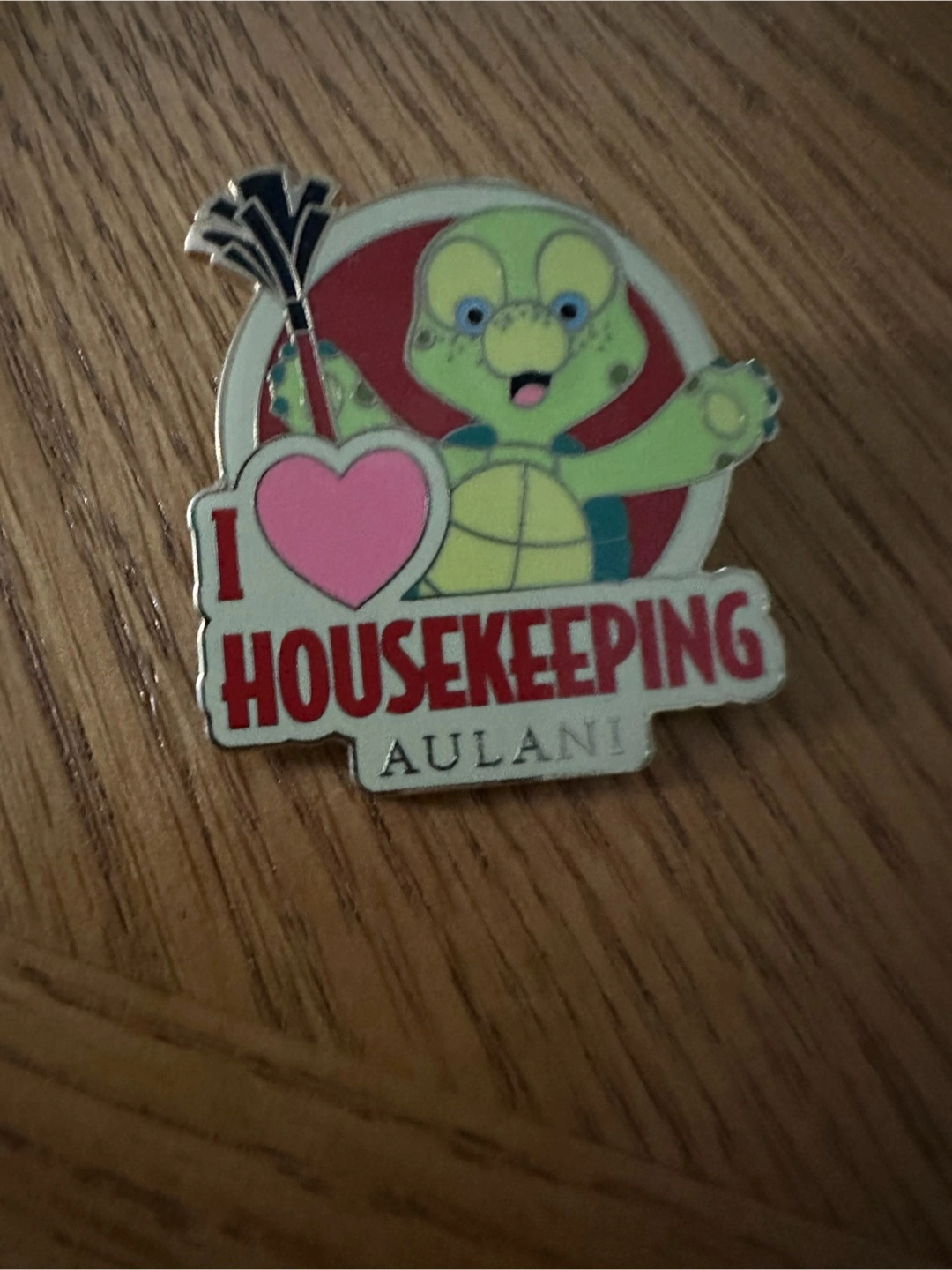 A pin with a turtle holding a broom and a pink heart. Reads "I Housekeeping Aulani." Pin has a red and white border. A perfect item to add to your collection and bring you joy.
