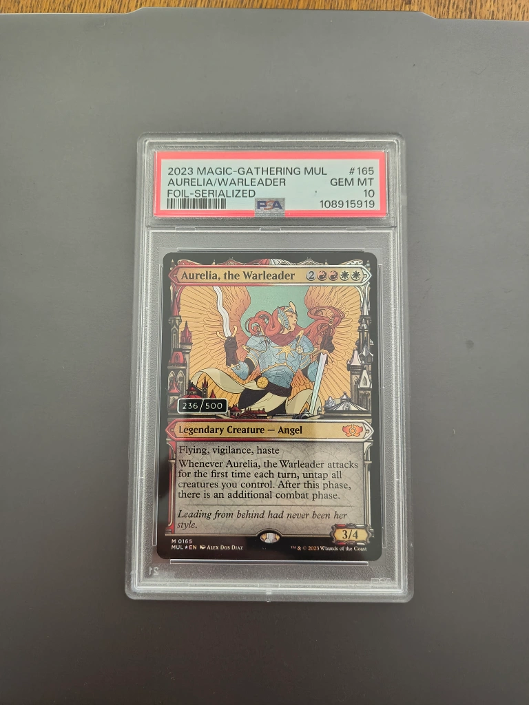 Selling a Magic: The Gathering card, Aurelia, the Warleader. This is a foil serialized card, graded GEM MT 10 by PSA. It's from the 2023 set.