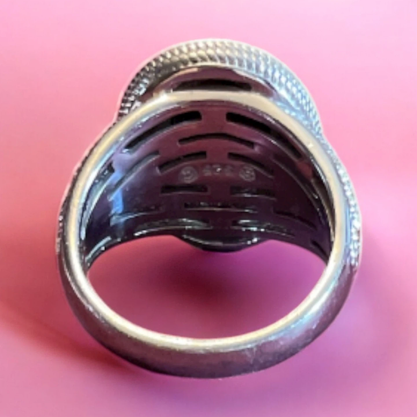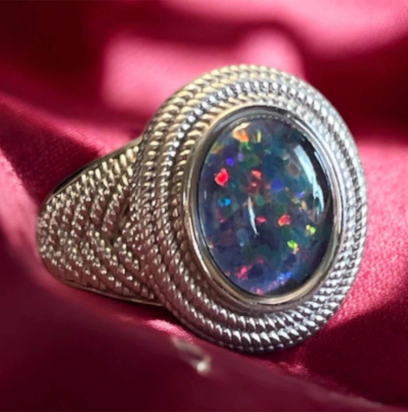 23This is a pre-owned Australian Opal Triplet sterling silver textured ring featuring an oval, bezel-set Australian opal triplet stone Captivate with color. A vibrant Australian opal triplet is framed by a textured border of sterling silver to create this beautiful ring. • Sterling silver • Gemstone weight is not given for triplet • Bezel set, oval Australian opal triplet; textured border; triplet made of Australian opal center, clear glass top, and black glass base; textured, tapered shank • Size 7.5