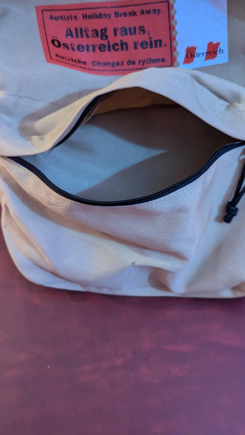 Selling a beige backpack with "Austria Holiday Break Away" design. It has a front pocket and a spacious main compartment. Good for everyday use or travelš§”