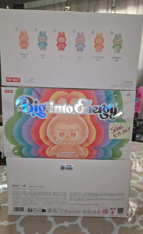 Authentic Popmart Big into Energy Labubus. ...... can scan for Authentication opened only from bottom to check card. Top & bag are sealed . Located Belmont/Austin area $45 1- Loyalty 2-Hope-SOLD 2-Love 3-Luck-SOLD 3-Happiness 1-Serenity Sesame Bean $45 Lynch Berry Sesame Beam Soy Milk Toffee
