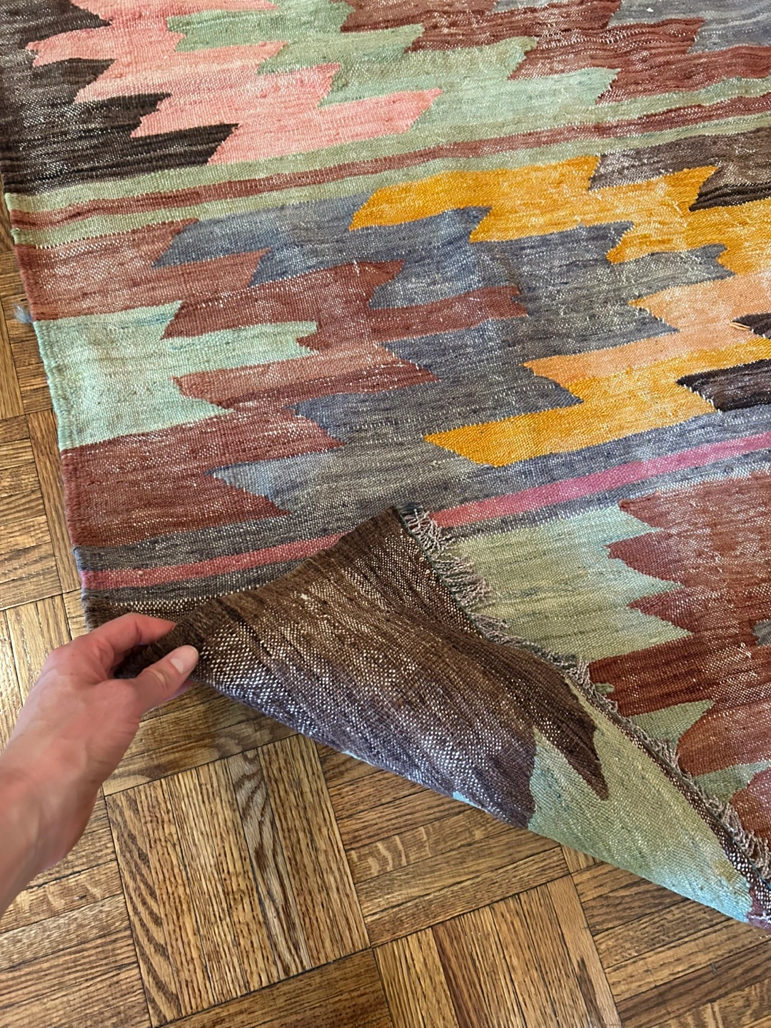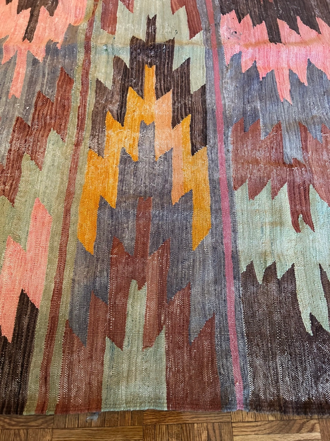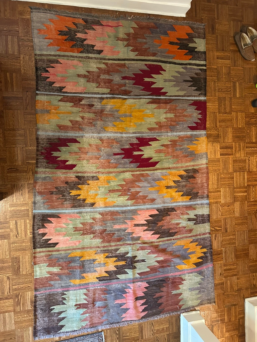 5Large Turkish area rug. Multicolored pattern. Worn aesthetic. Easy to transport. I bought this rug in Istanbul last year, but I’m moving and it no longer fits my space. Looking for a new home!