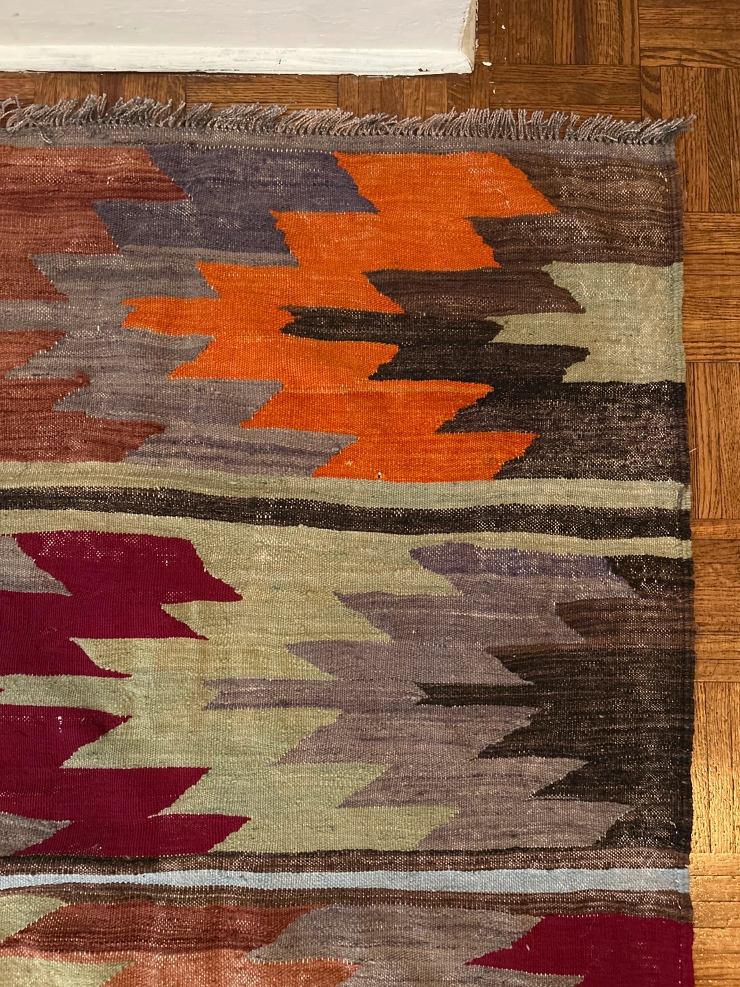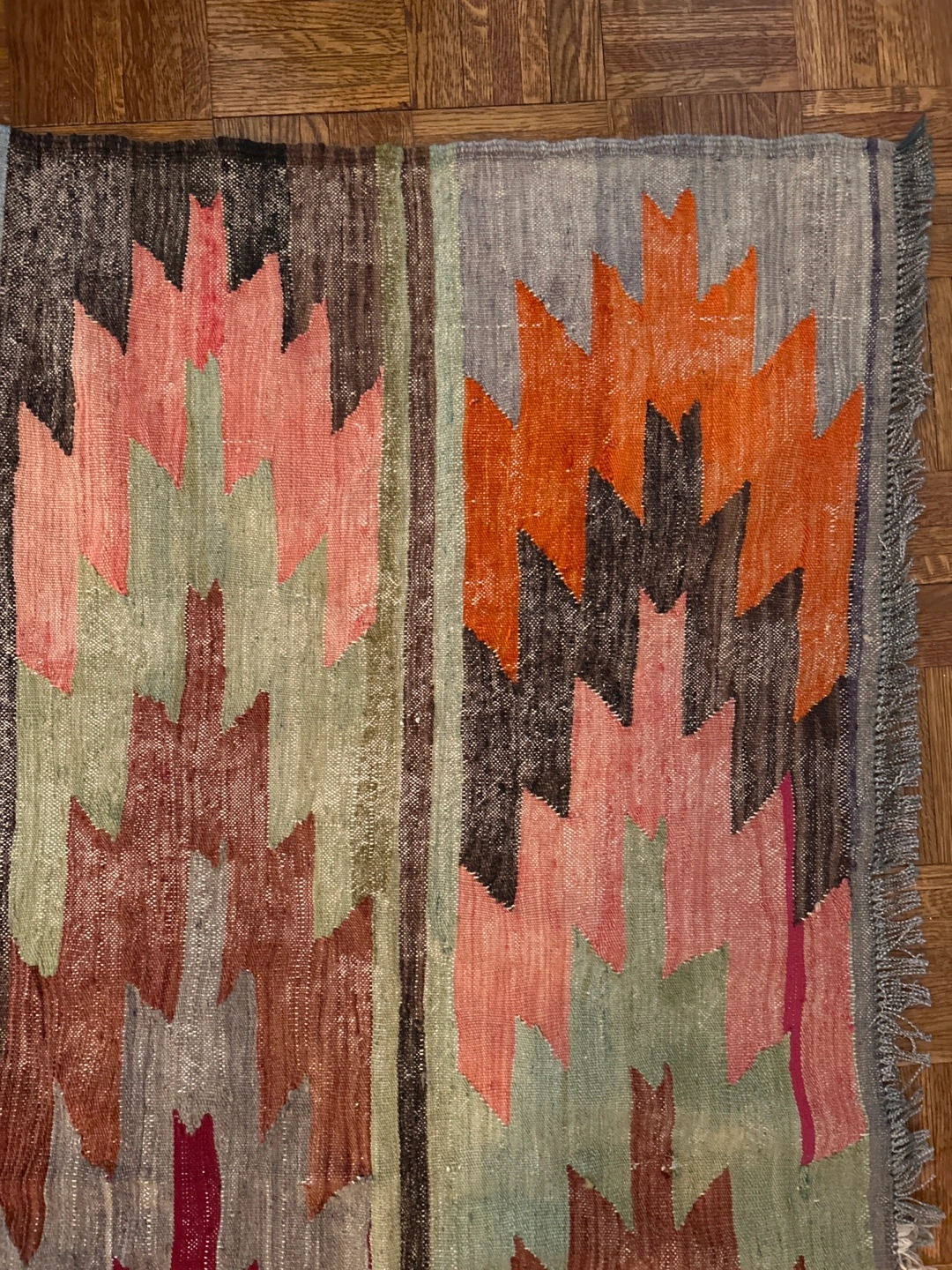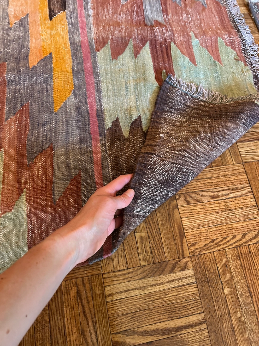 5Large Turkish area rug. Multicolored pattern. Worn aesthetic. Easy to transport. I bought this rug in Istanbul last year, but I’m moving and it no longer fits my space. Looking for a new home!