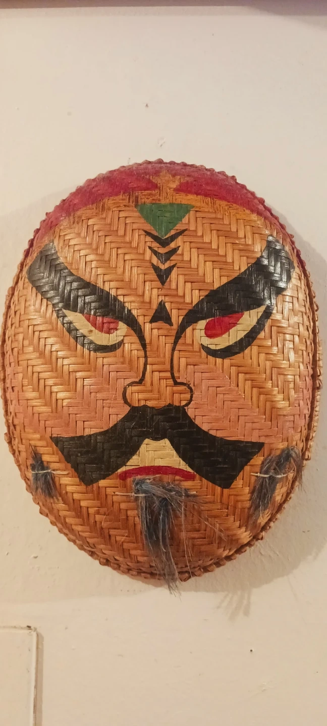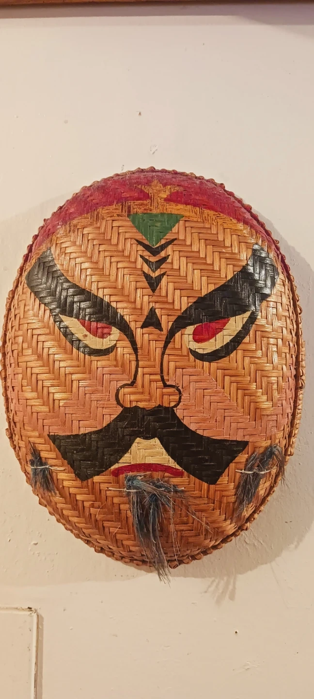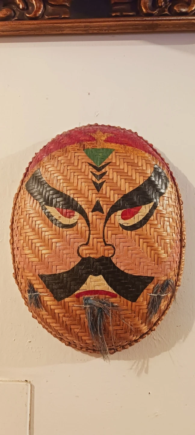1000+Beautiful Authentic Unique Handcrafted Hand Painted Bamboo Woven Mask Wall Decor. Perfect for adding a touch of cultural flair to your home decor. It features a hand-painted face with striking details. It's in great condition and ready to hang! 10"×7". Excellent condition. ALL MY PRICES ARE NEGOTIABLE !! HANDMADE IN VIETNAM 🇻🇳.