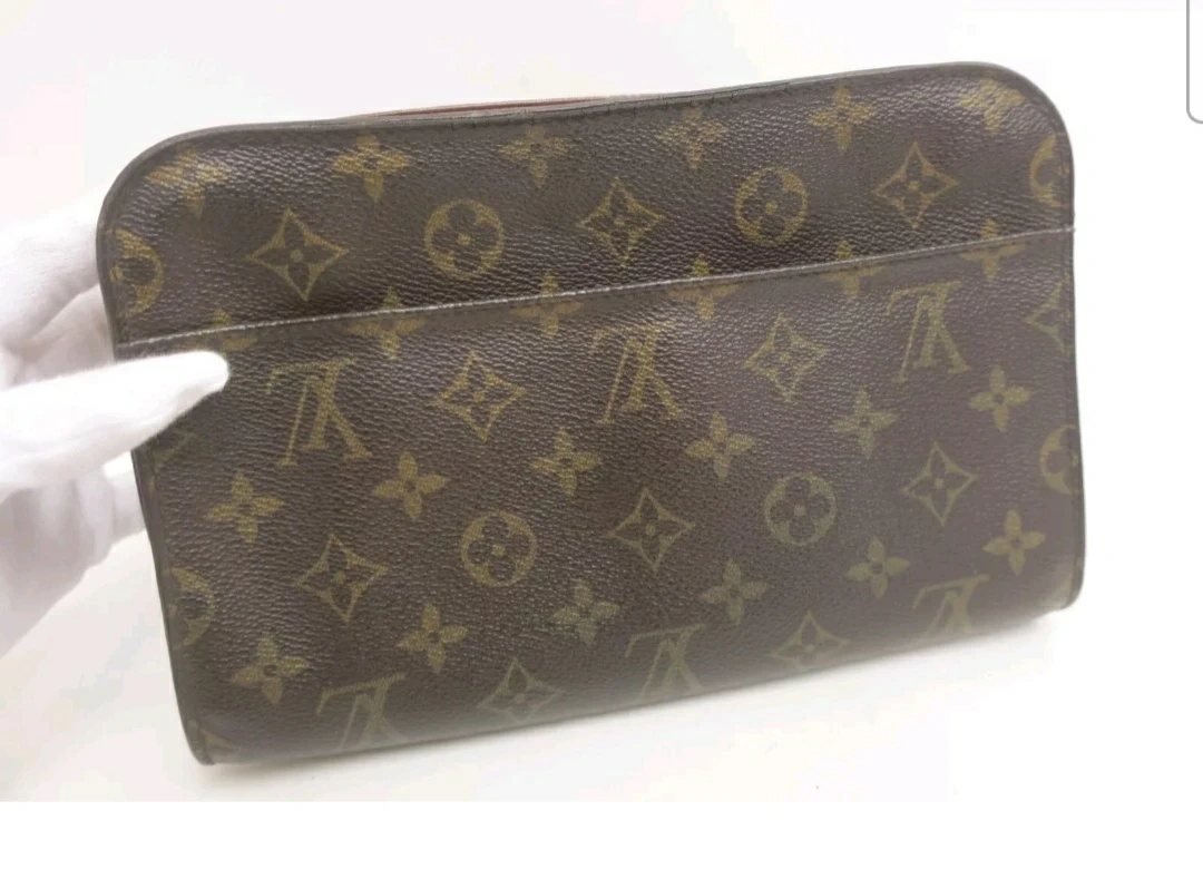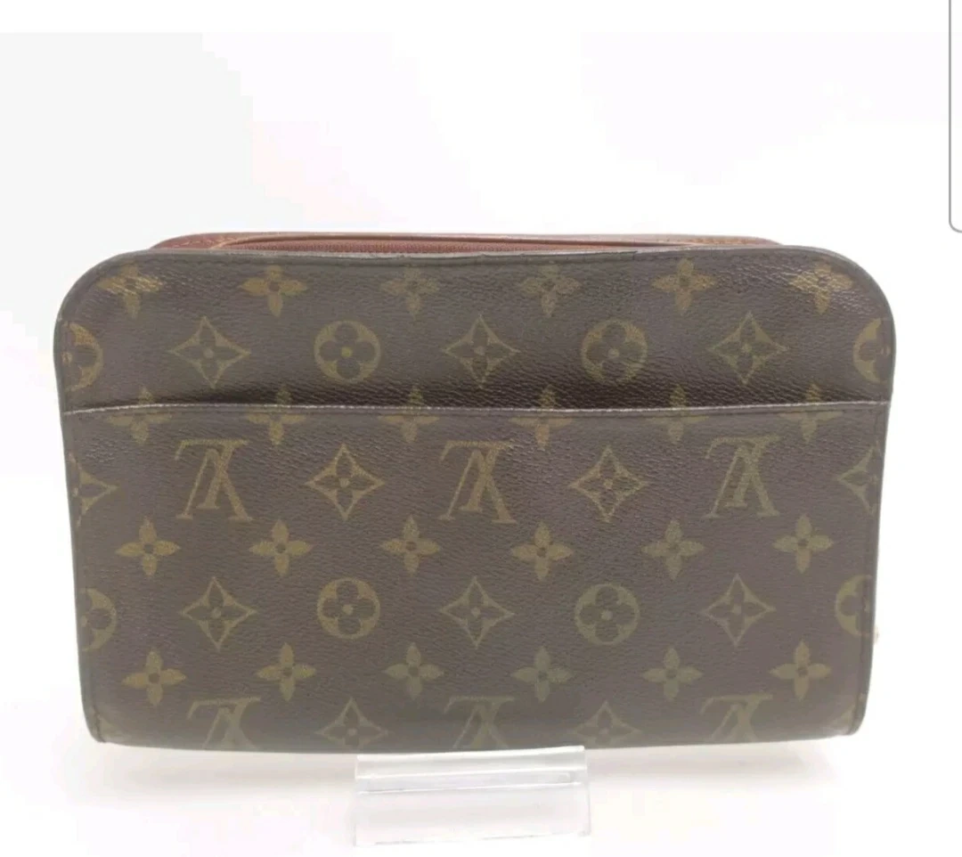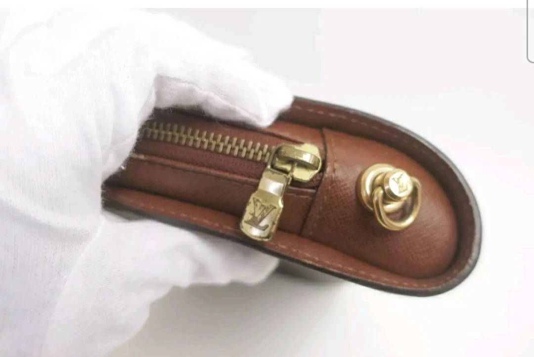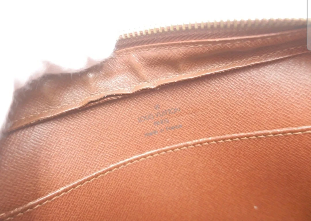 95Vintage Louis Vuitton Monogram Cosmetic Pouch. Brown monogram canvas with gold hardware and a zipper closure.