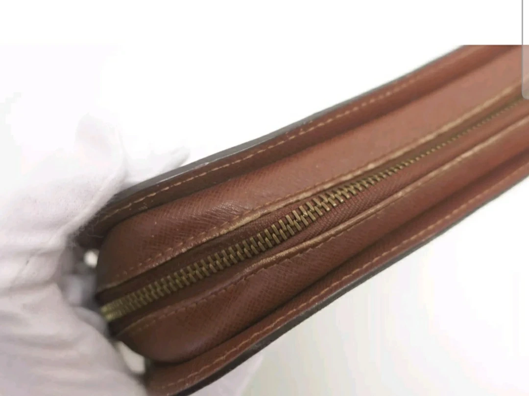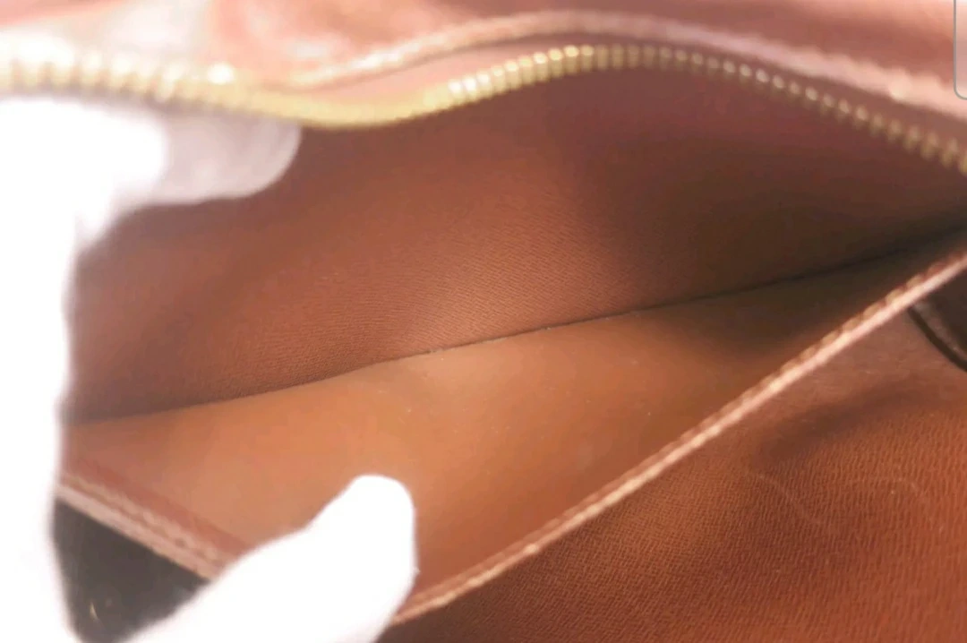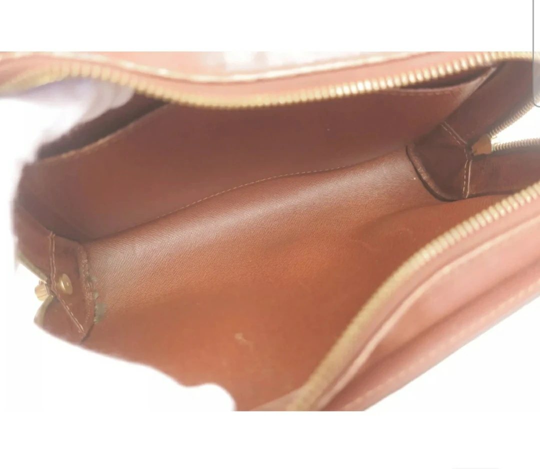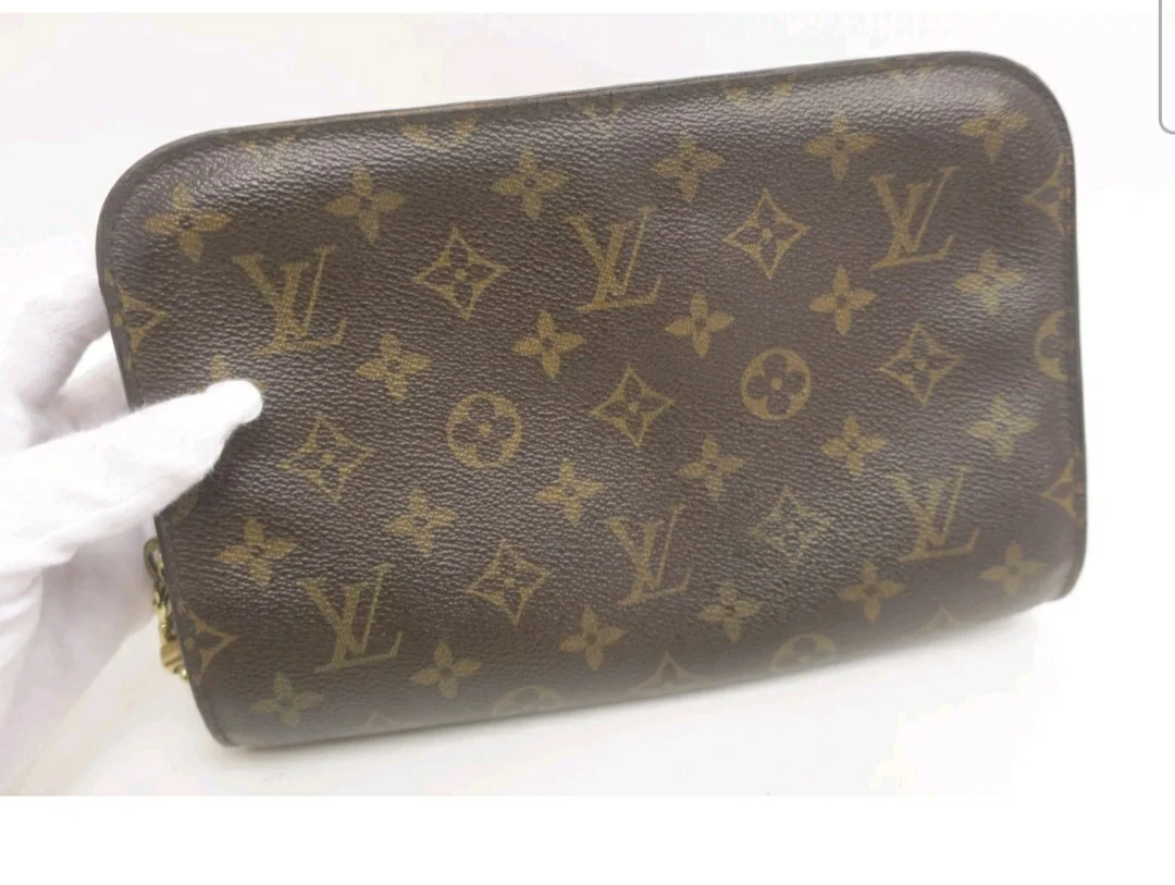 95Vintage Louis Vuitton Monogram Cosmetic Pouch. Brown monogram canvas with gold hardware and a zipper closure.