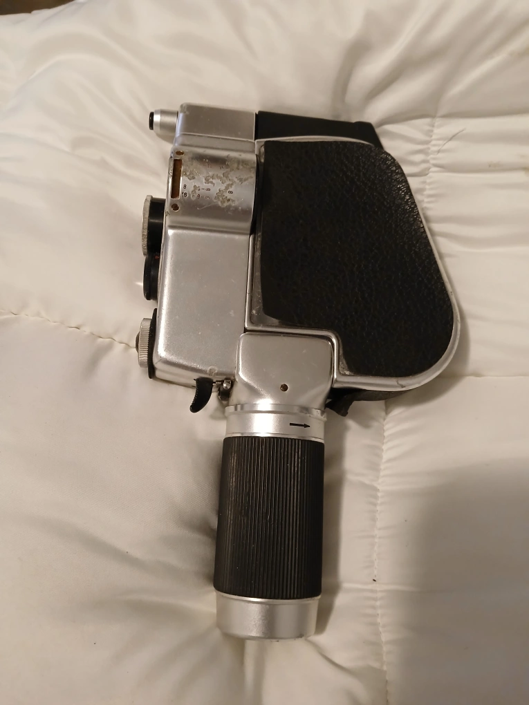 Selling an Auto Carena Schneider Optik movie camera. It has a silver and black design with some wear and tear on the silver parts. Great for vintage film enthusiasts