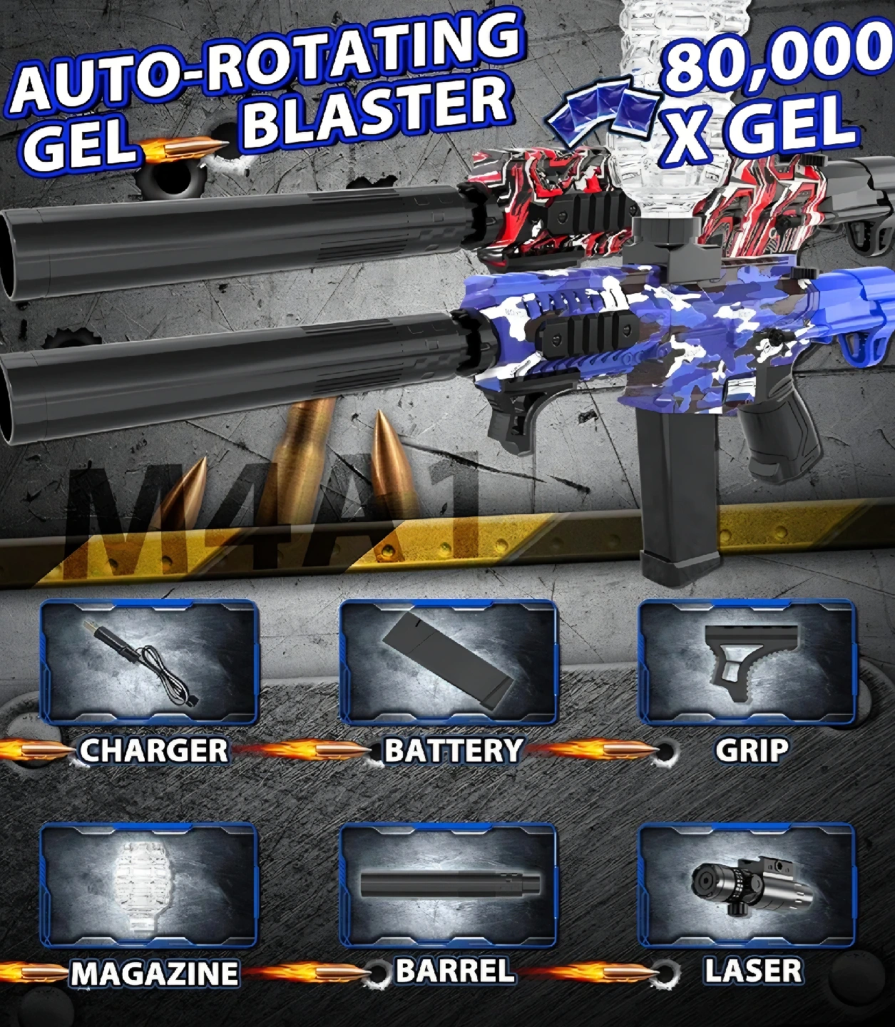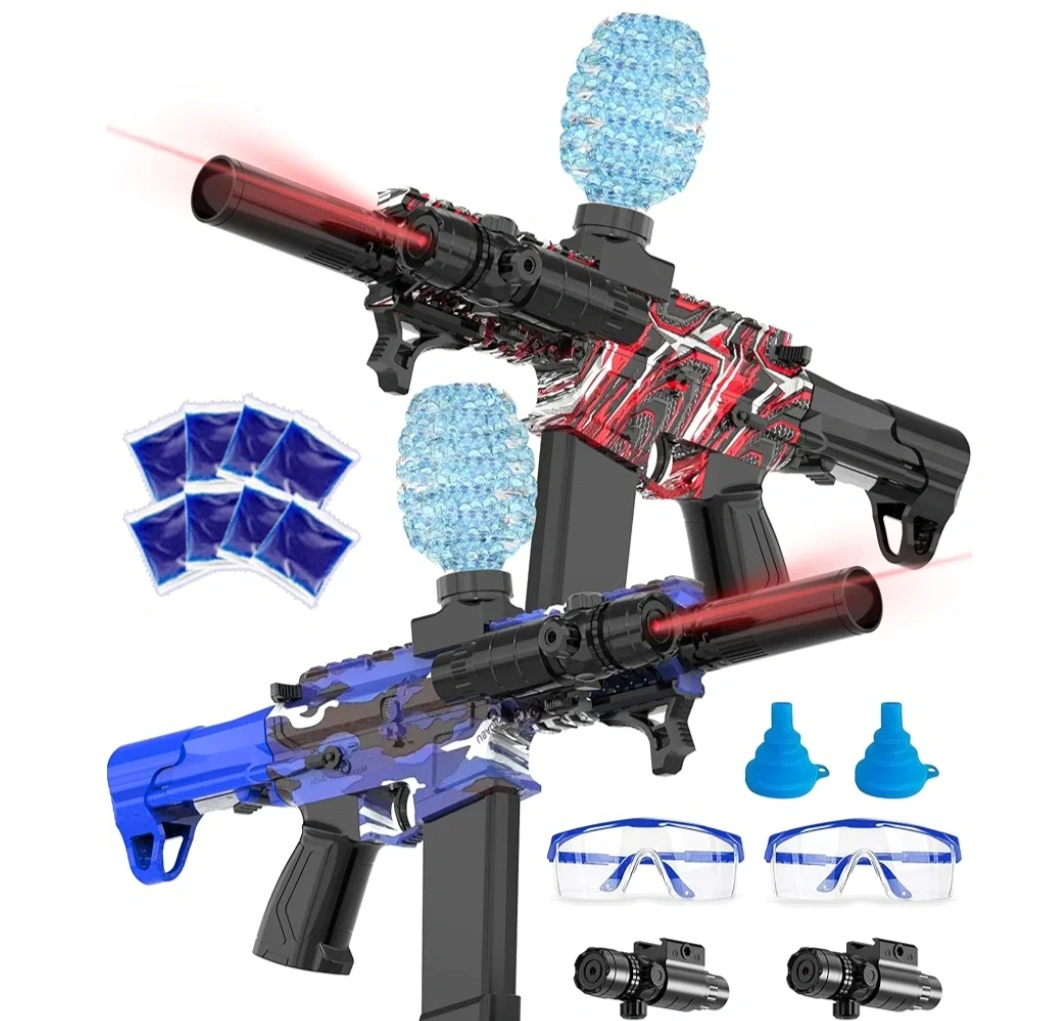 I'm selling an auto-rotating gel blaster. It comes with a charger, battery, grip, magazine, barrel, and laser. Also included are safety glasses and gel refills