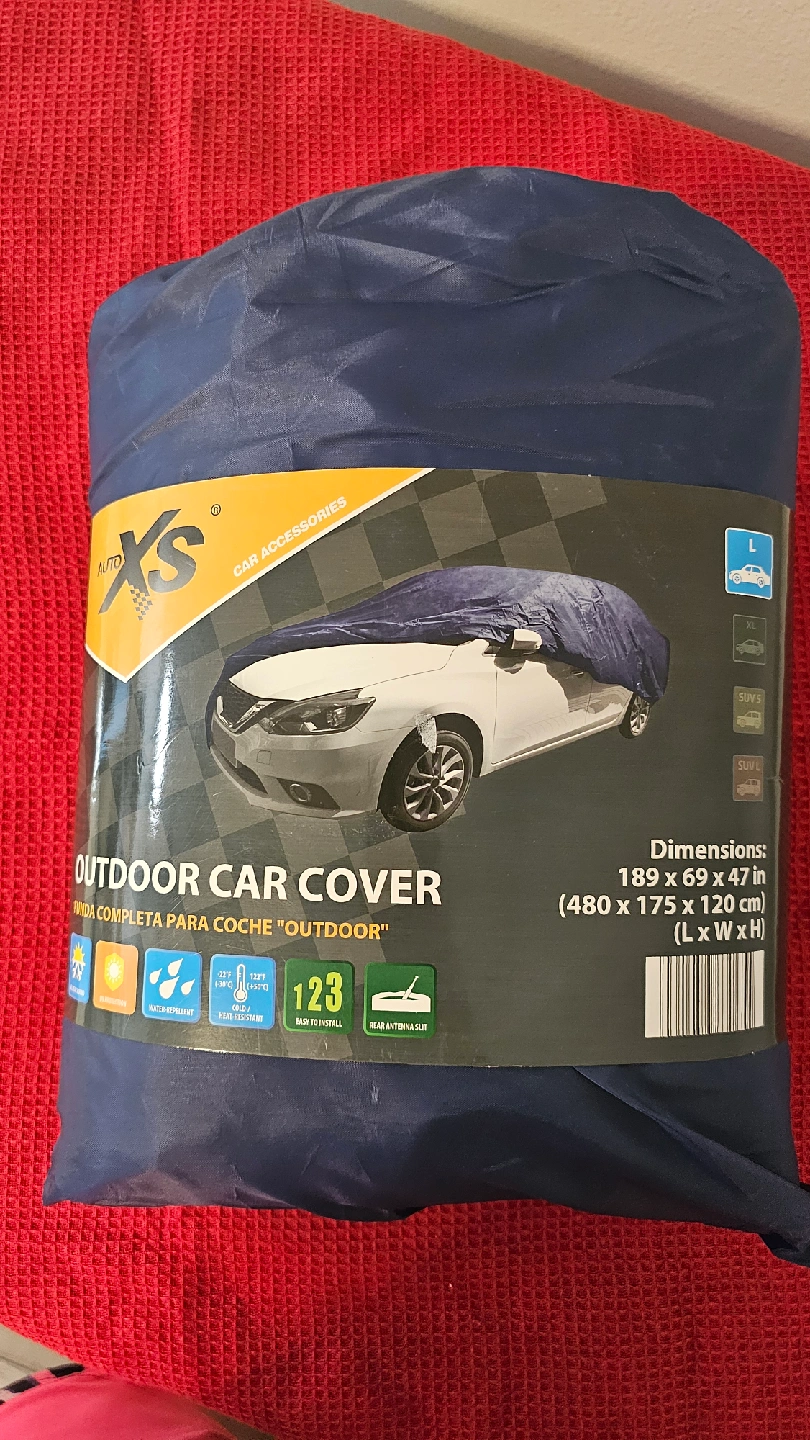 65Selling a new Auto XS Outdoor Car Cover in size L! It's designed to fit a variety of car types, including sedans, SUVs, and XL vehicles. The cover's dimensions are 189 x 69 x 47 inches (480 x 175 x 120 cm). It's waterproof, UV resistant, and easy to install with a rear antenna slit. ¡Vendo una nueva cubierta de coche al aire libre Auto XS en tamaño L! Está diseñado para adaptarse a una variedad de tipos de automóviles, incluidos sedanes, SUV y vehículos XL. Las dimensiones de la cubierta son de 189 x 69 x 47 pulgadas (480 x 175 x 120 cm). Es resistente al agua, resistente a los rayos UV y fácil de instalar con una ranura de antena trasera.