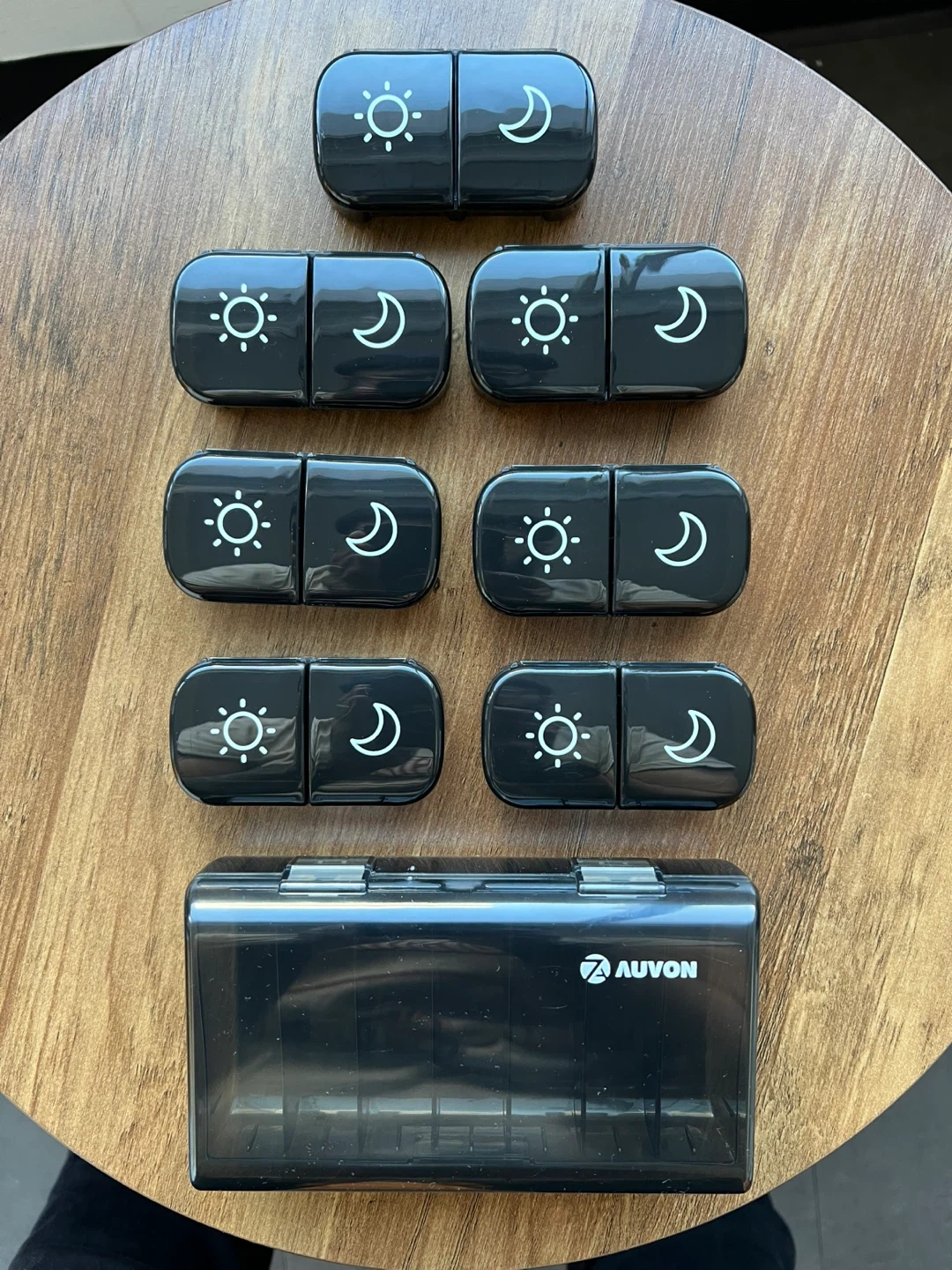 124LEAVING NYC IN THE WINTER 🥲 I bought this for my mom thinking it would help but she didn’t like the design so it ended up only being used for one week. lol This is an Auvon pill organizer. It's a weekly pill organizer with compartments for each day of the week. Each day has a compartment for daytime and nighttime pills.