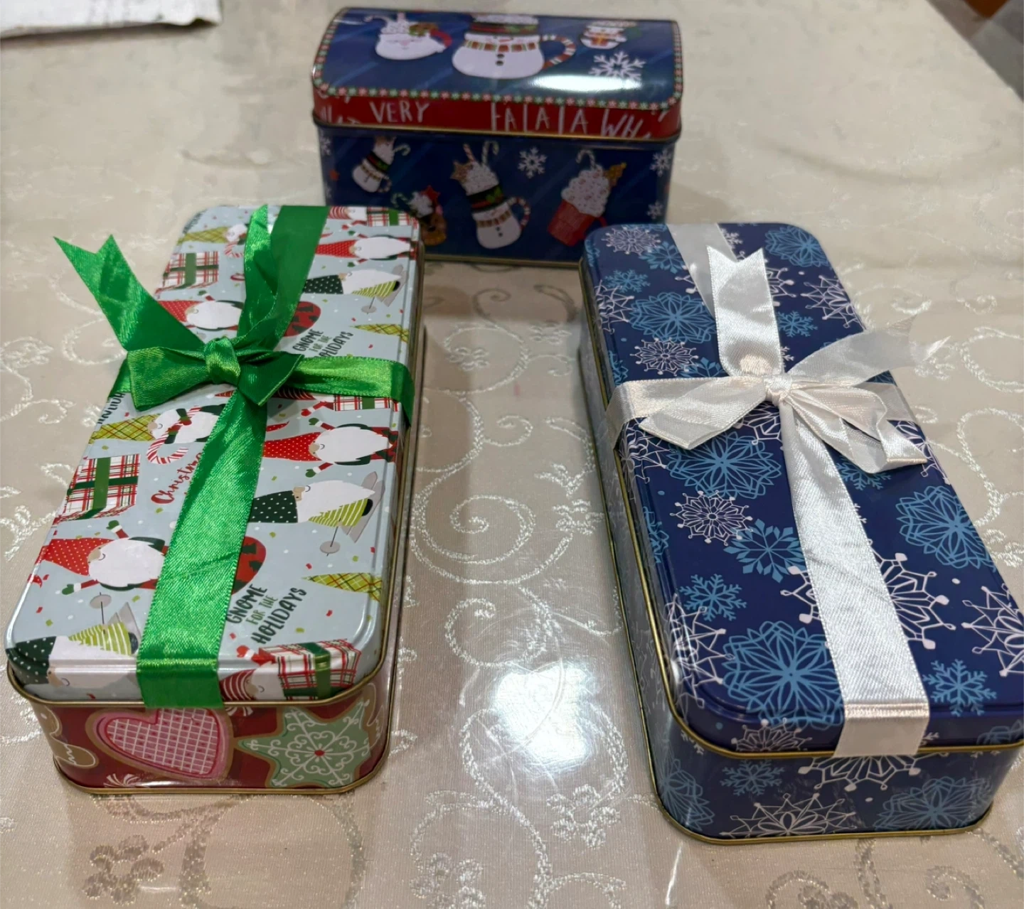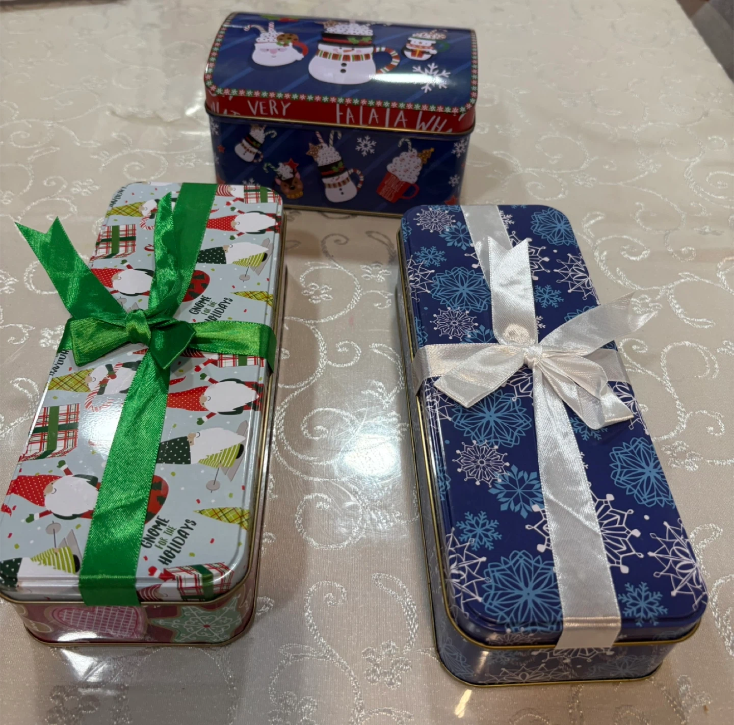 Selling a set of decorative holiday tins! They're perfect for storing cookies, small gifts, or other treasures during the holiday season. The tins come in various festive designs, including snowmen, snowflakes, and gnomes, adding a touch of holiday cheer to any space