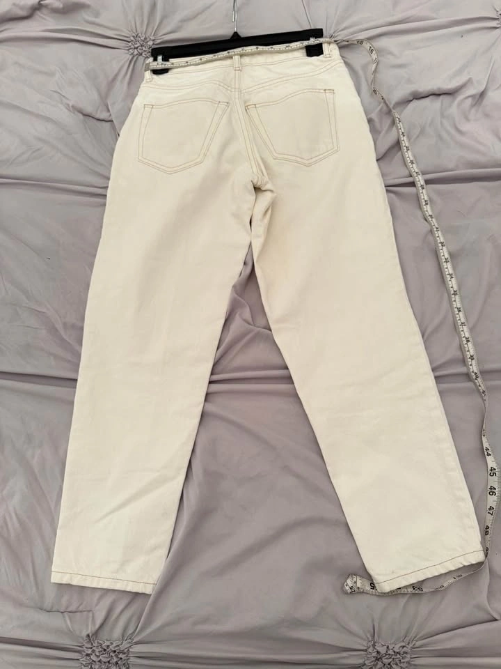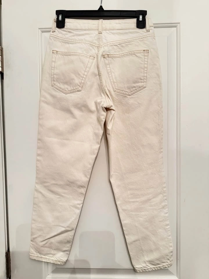 Classic high-rise mom fit in a clean off-white wash with 5-pocket styling and button/zip closure. Easy to dress up or down—perfect with sneakers, boots, or a blazer.