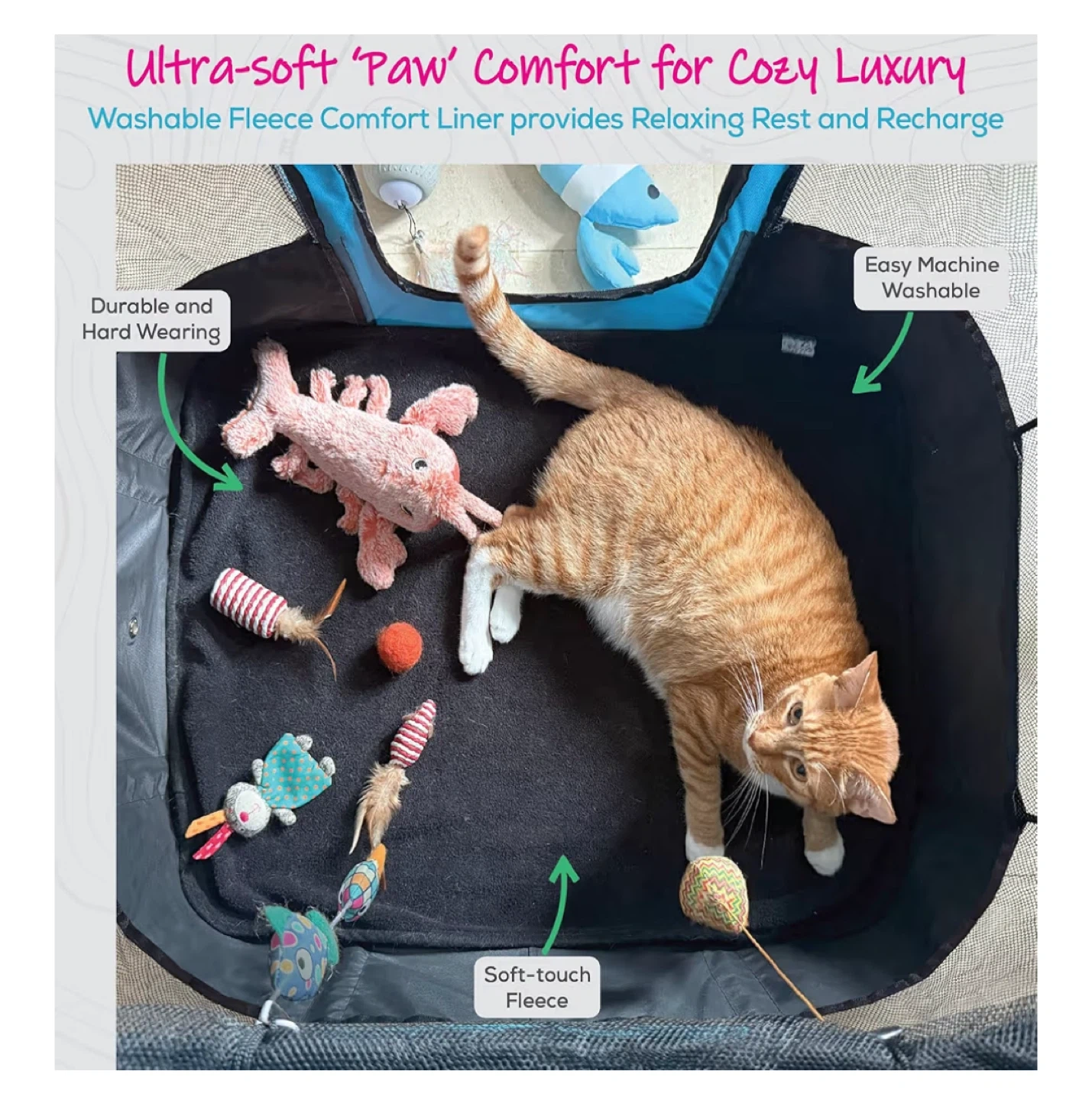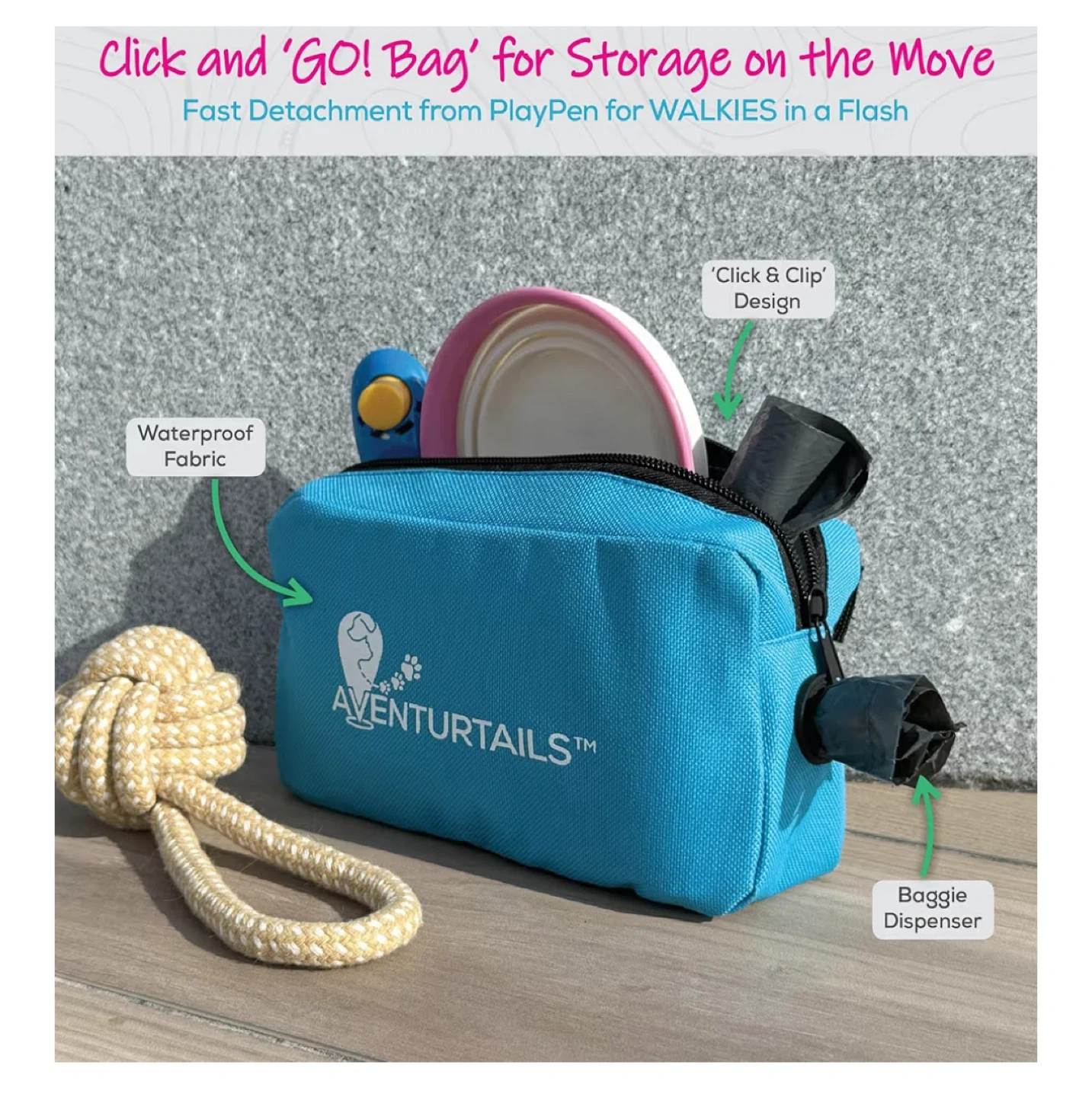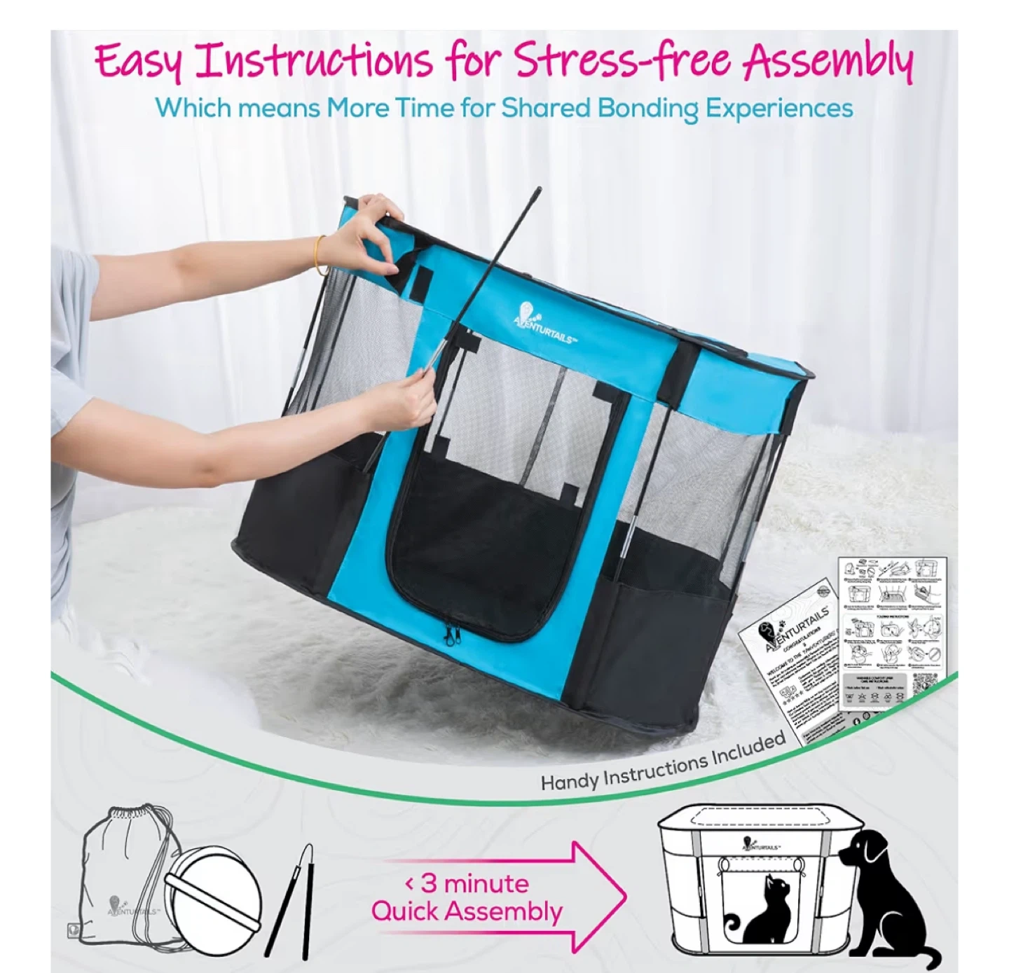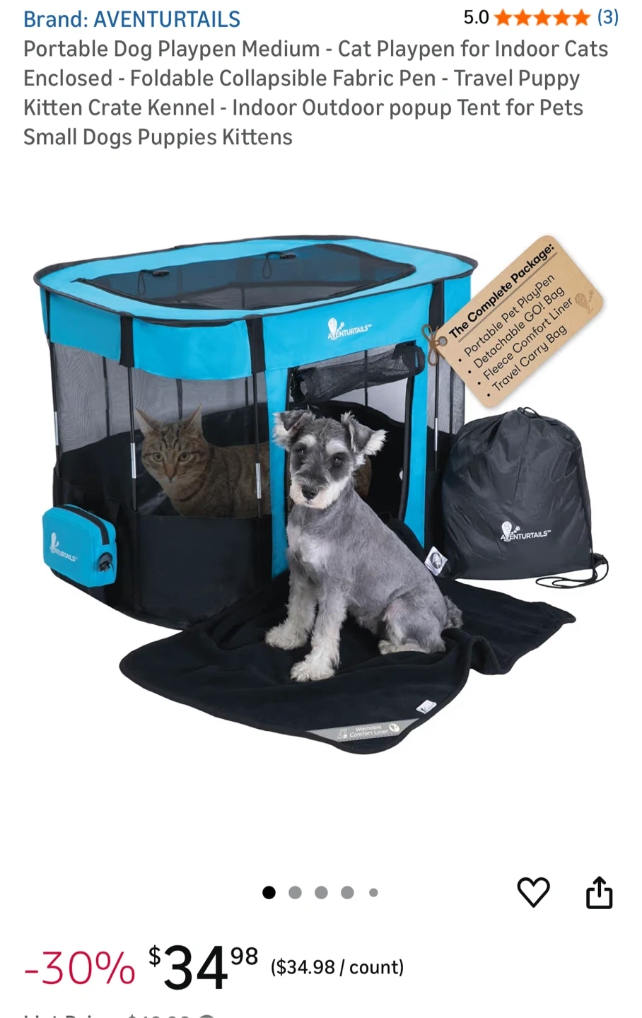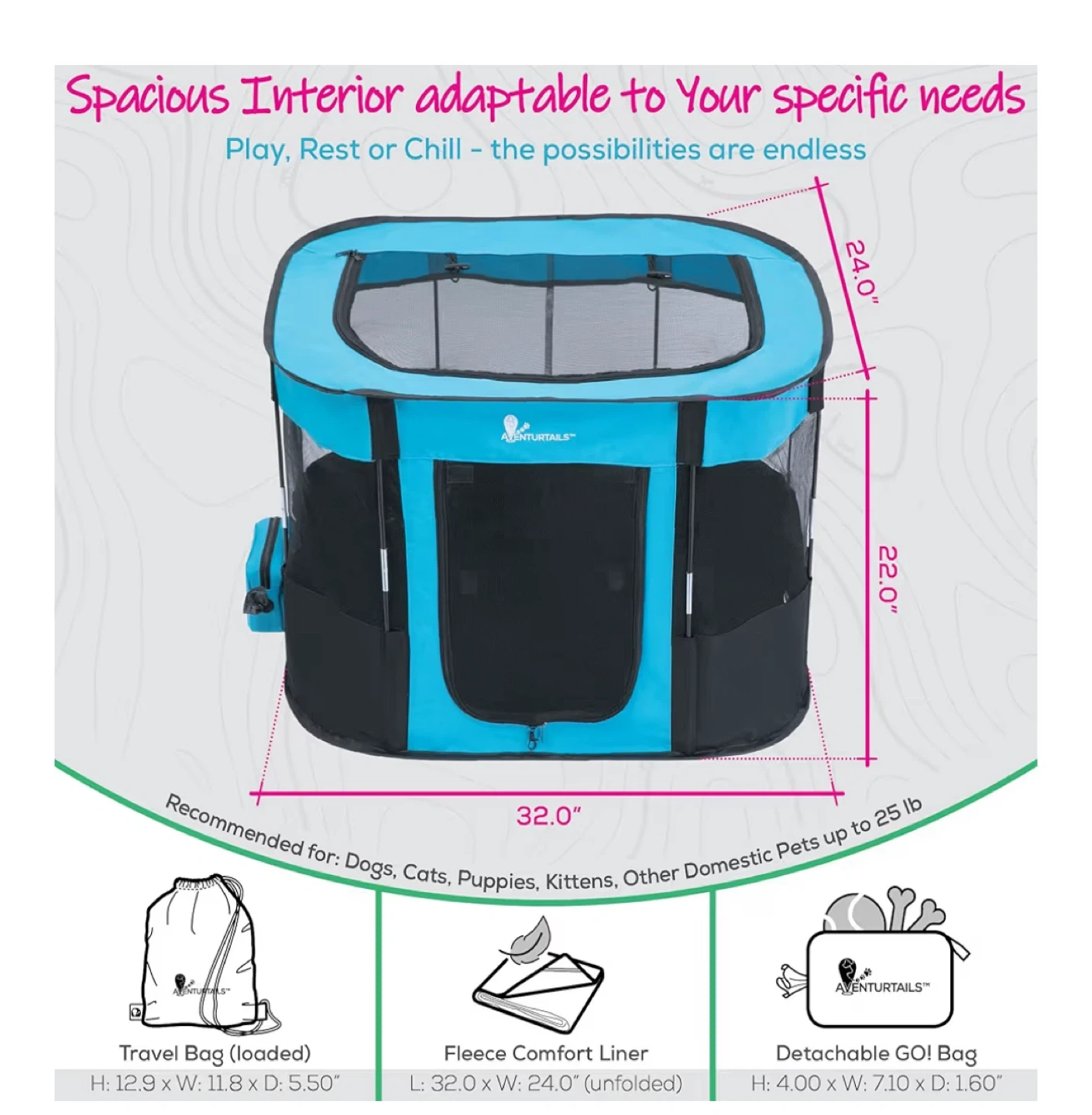 This Aventurtails portable pet playpen is perfect for indoor or outdoor use! It's a medium size and features a foldable, collapsible fabric pen design. It's recommended for dogs, cats, puppies, kittens, and other domestic pets up to 25 lbs. The playpen has a spacious interior and includes a detachable GO! bag, fleece comfort liner, and travel carry bag.