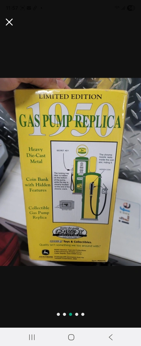 A replica of a 1950 gas pump. The item is a coin bank. Features include hidden features and a secret key. Perfect for collecting change, it's something to bring you peace of mind.