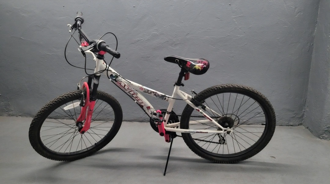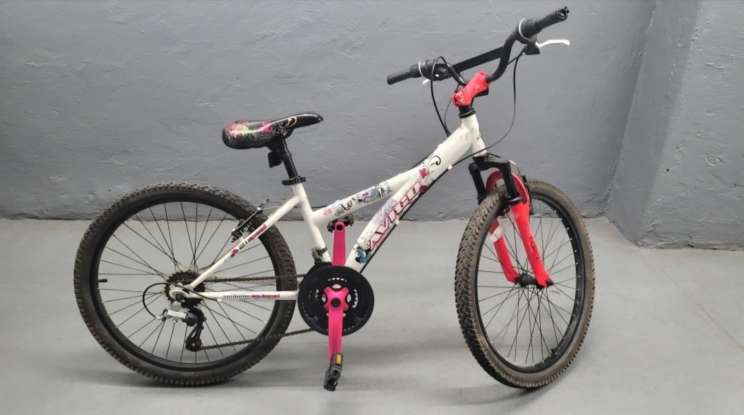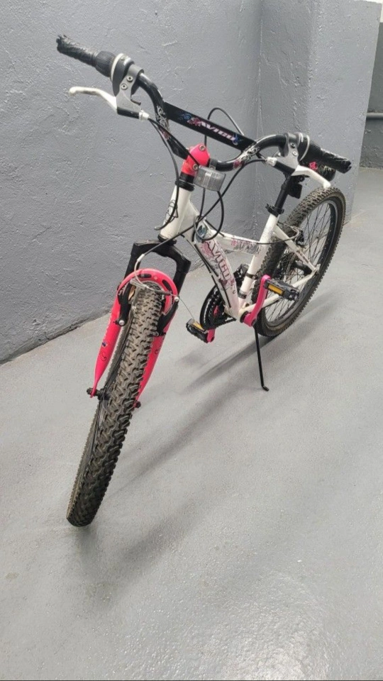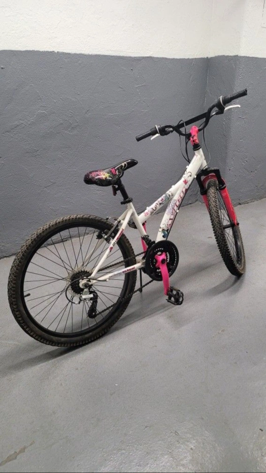 Selling a gently used Avigo girls' mountain bike in white and pink. It's a 21 speed bike in good condition. Everything works fine. Both handle grips are chipped at the ends and may need to be replaced. The frame is 14", the wheels are 24". No shipping. Pickup only.