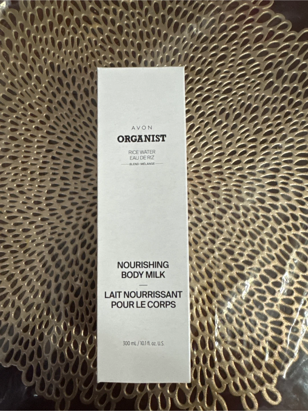 Selling a bottle of Avon Organist Nourishing Body Milk. It contains rice water and is a blend melange. The bottle contains 300 mL / 10.1 fl oz