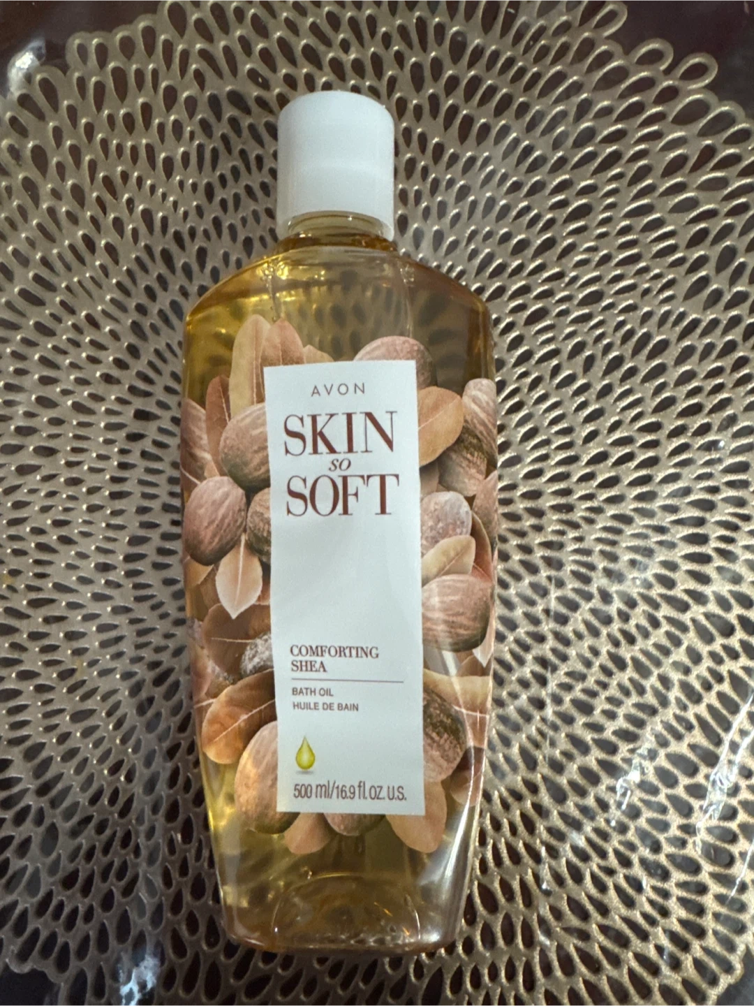 Selling a new bottle of Avon Skin So Soft Comforting Shea Bath Oil. This bath oil contains comforting shea and comes in a 500 ml/16.9 fl. oz bottle. Perfect for a relaxing bath!
