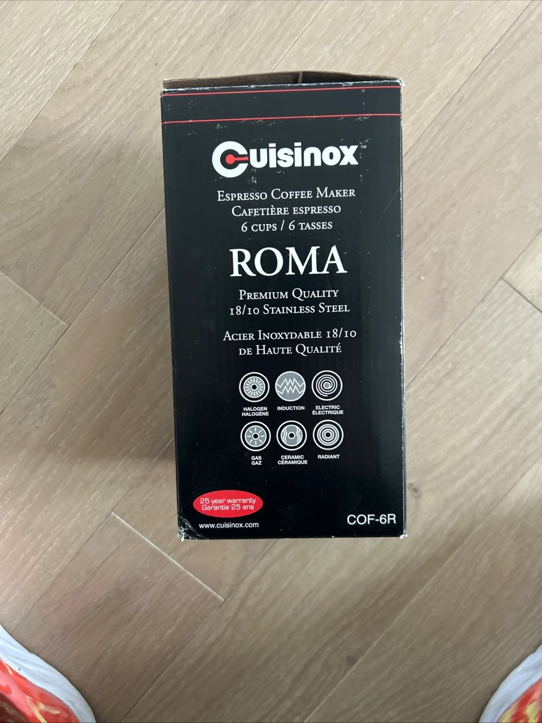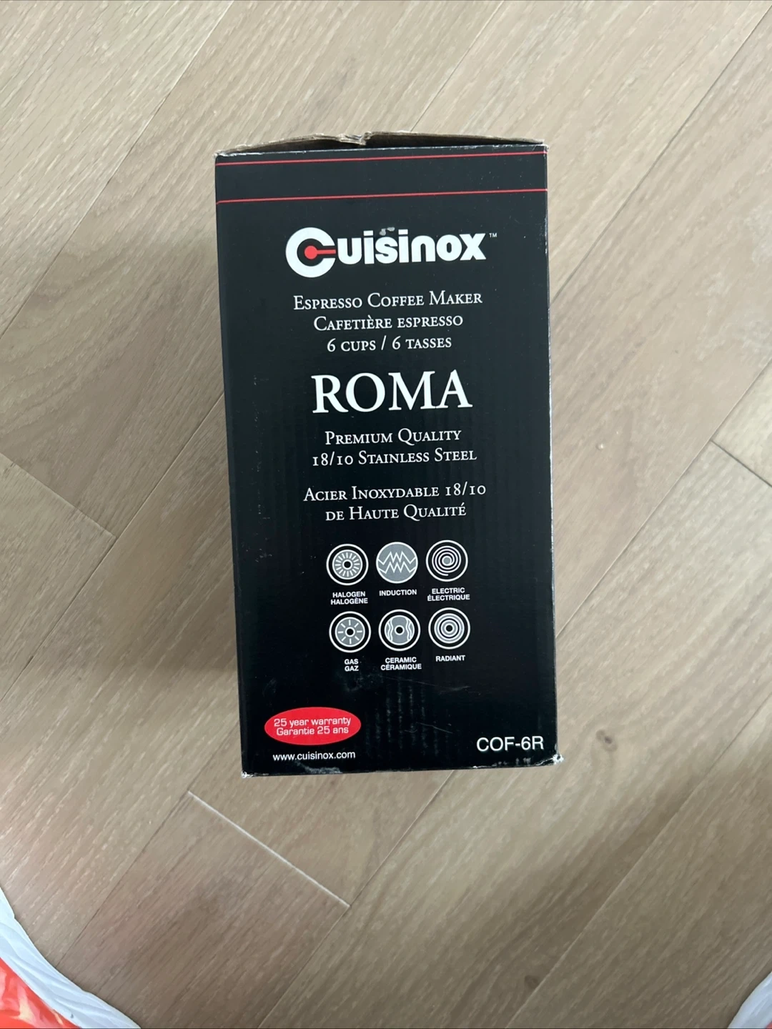 This Cuisinox Roma espresso coffee maker is made of 18/10 stainless steel. It's designed for 6 cups and is compatible with halogen, induction, gas, ceramic, and radiant heat sources. It's a premium quality stovetop espresso maker.