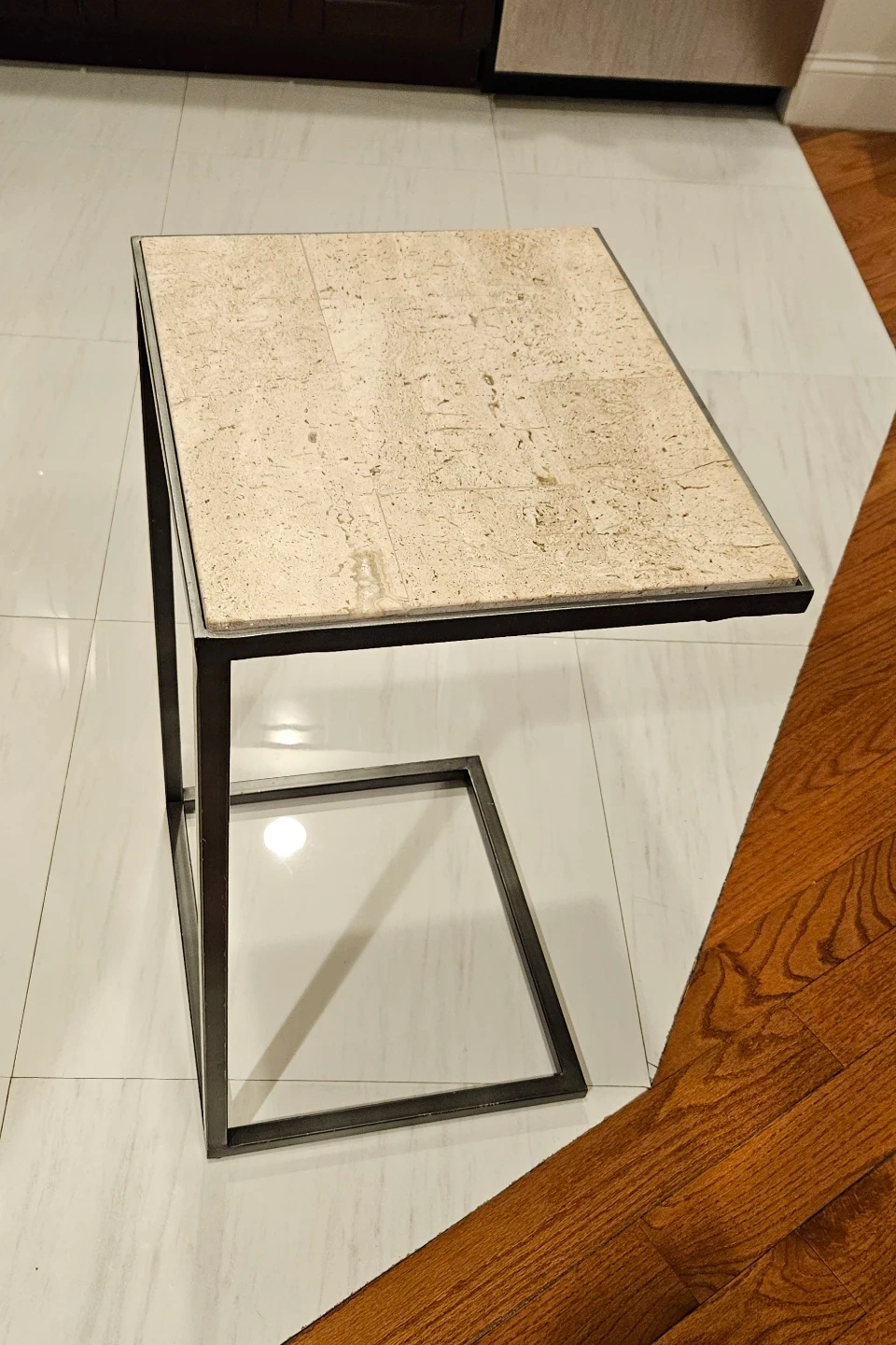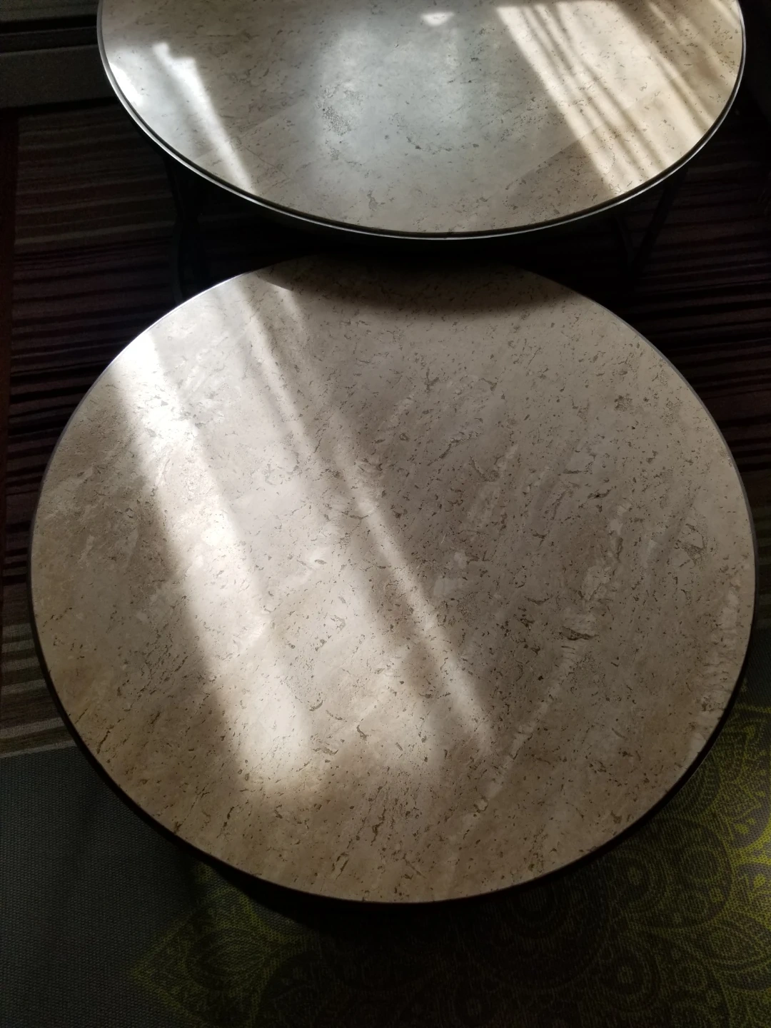 Classic contemporary style accent tables with a travertine marble top and a metal frame with pewter finish. Dimensions for the larger round table is 36"x36"x20".