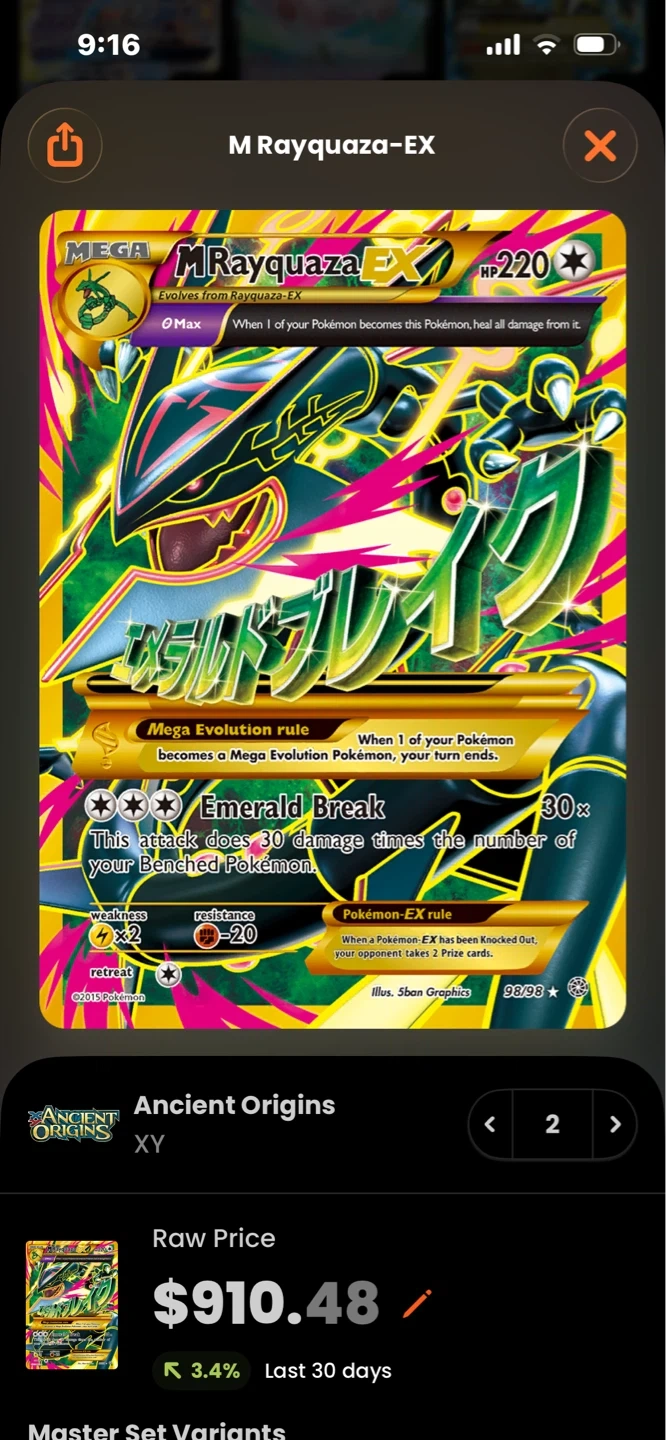 This is a M Rayquaza-EX card from the Ancient Origins set. It has an HP of 220 and its attack is Emerald Break. The card is from 2015.