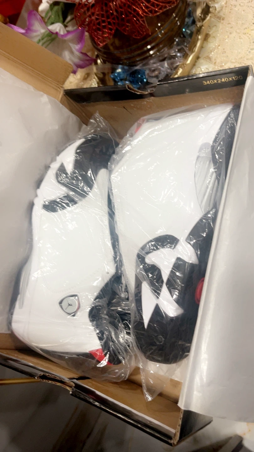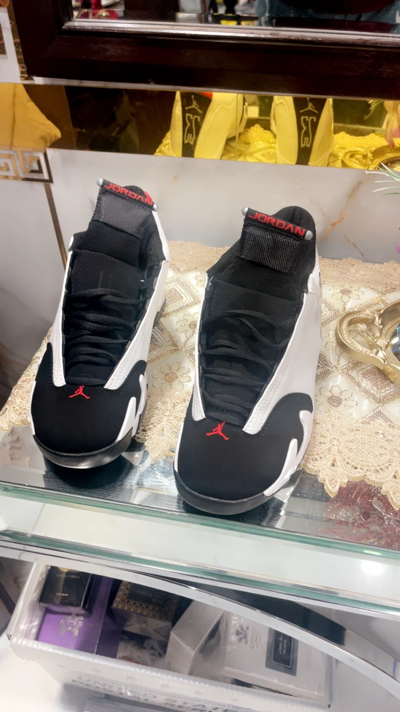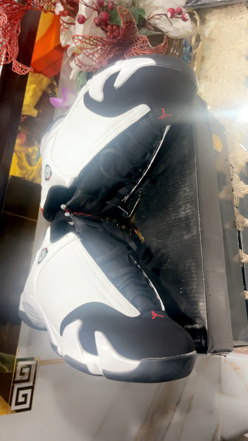These Air Jordan 14 Retro sneakers are in a "Black Toe" colorway. They feature a mix of white, black, and red. The original box is included. Size 8, 9,