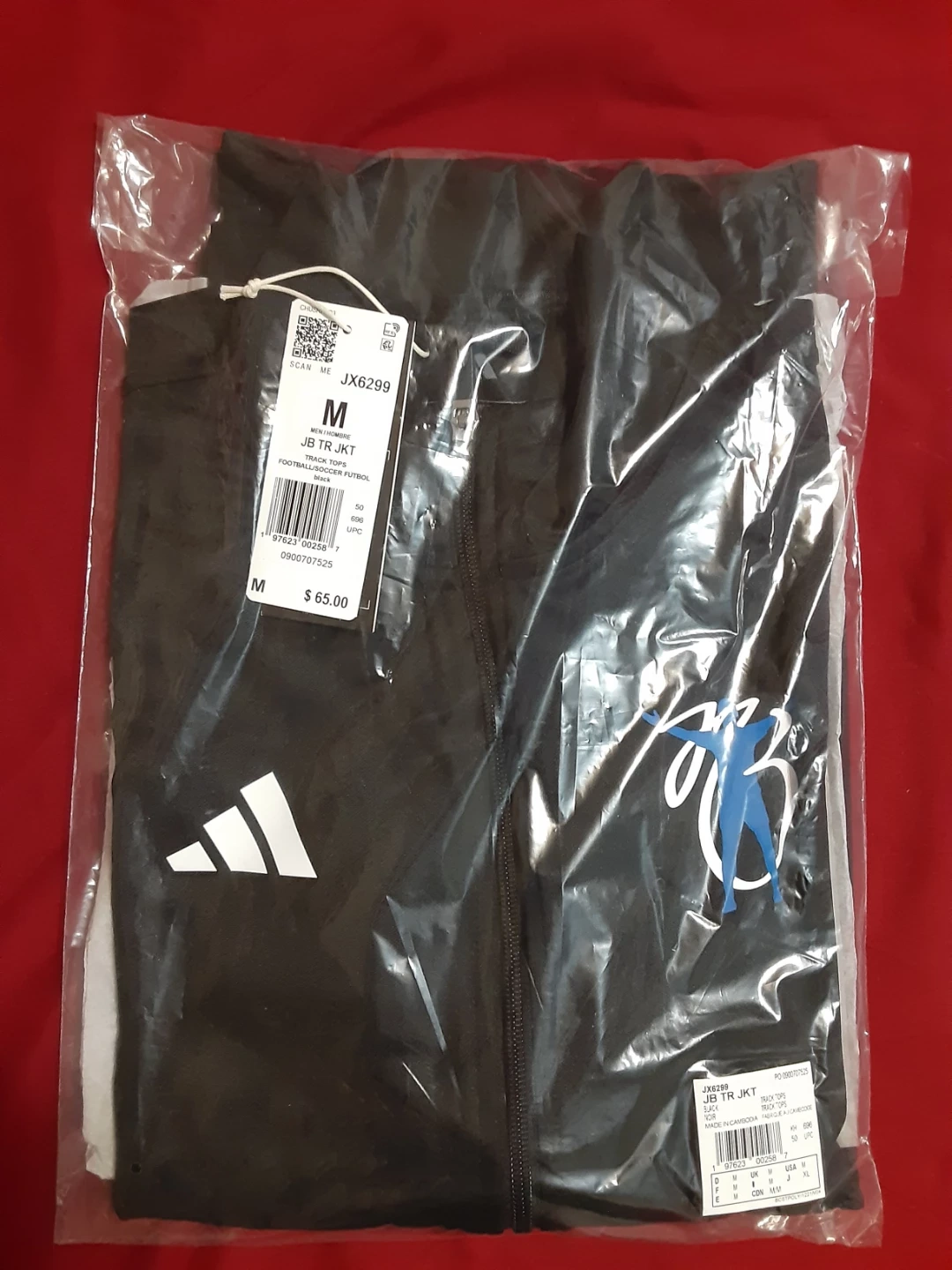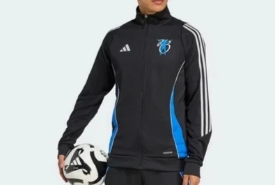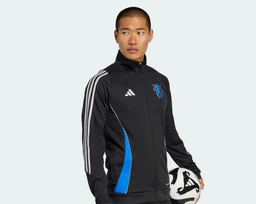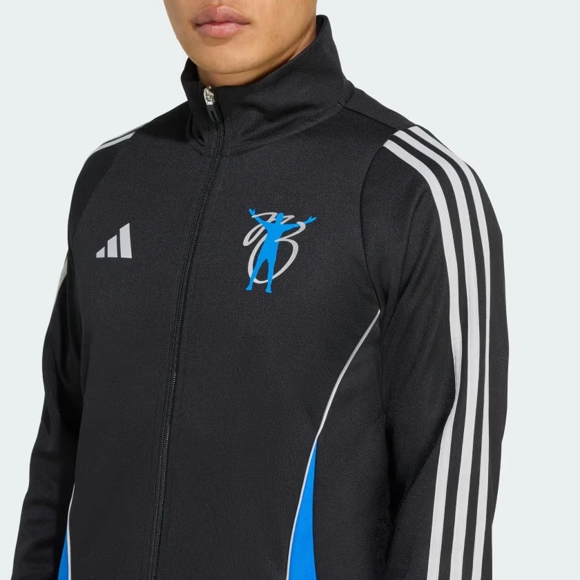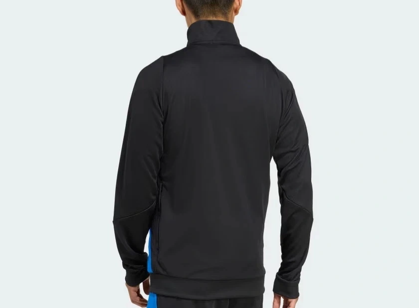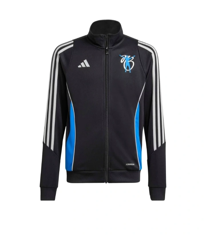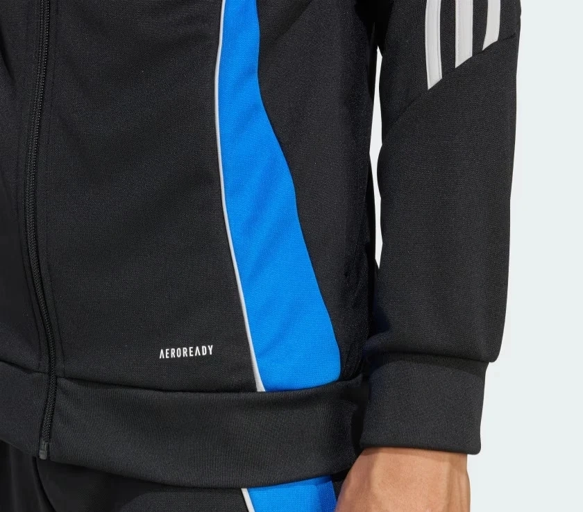 This Adidas track jacket is black with blue side panels and white stripes on the sleeves. It features the AEROREADY technology for moisture-wicking. There's a blue graphic logo on the chest.