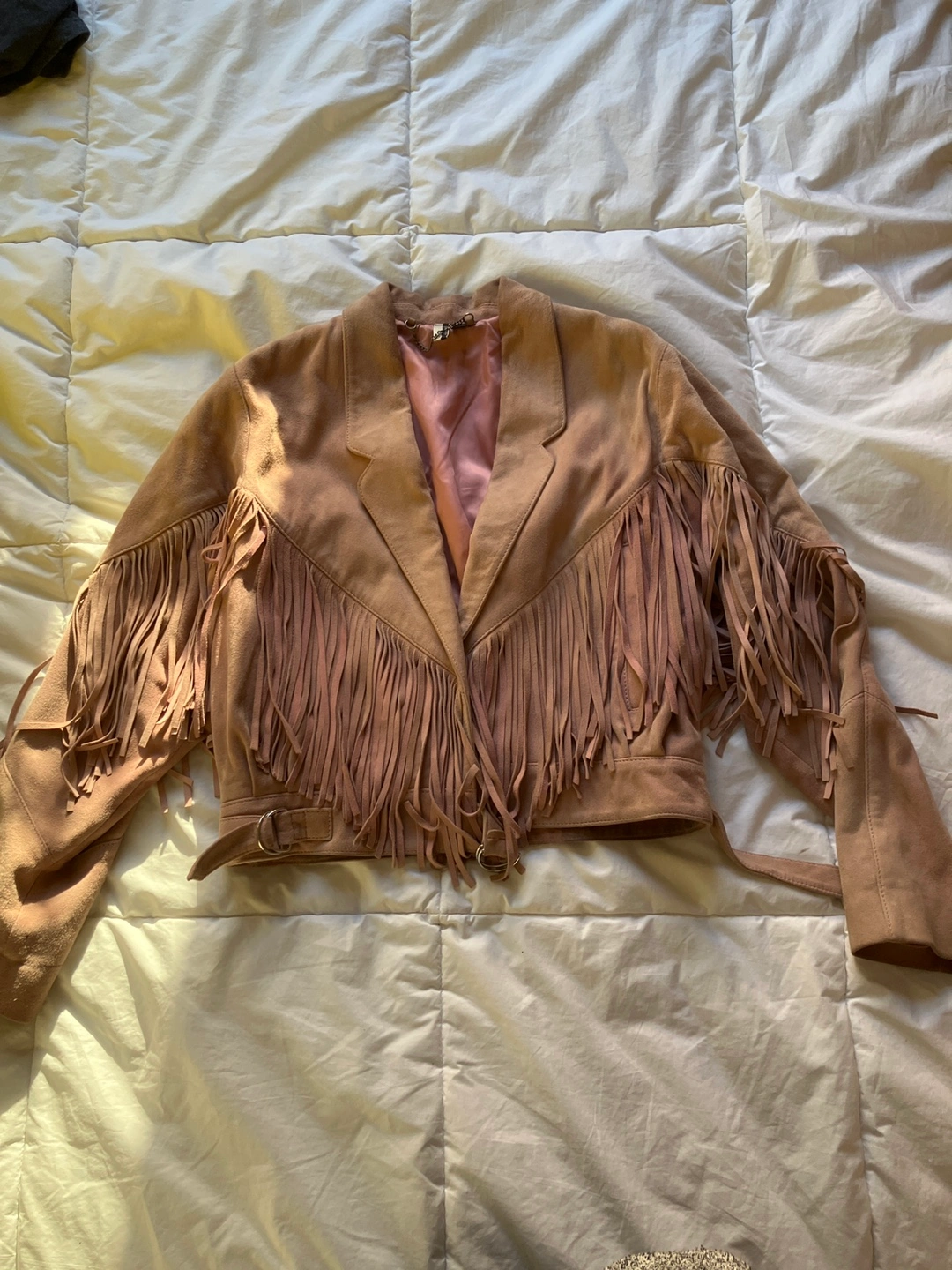 Pink suede jacket with fringe detailing on the front, back, and sleeves. It has a pointed collar and a buckle closure at the waist. The lining is a soft pink satin.