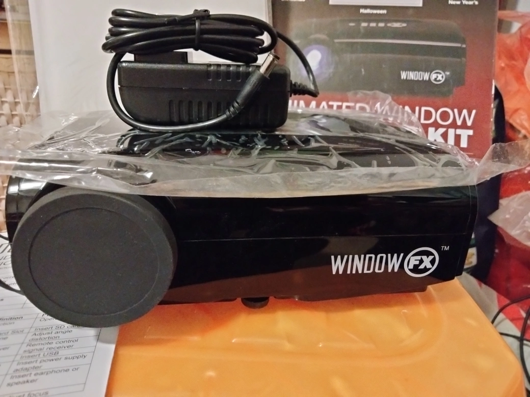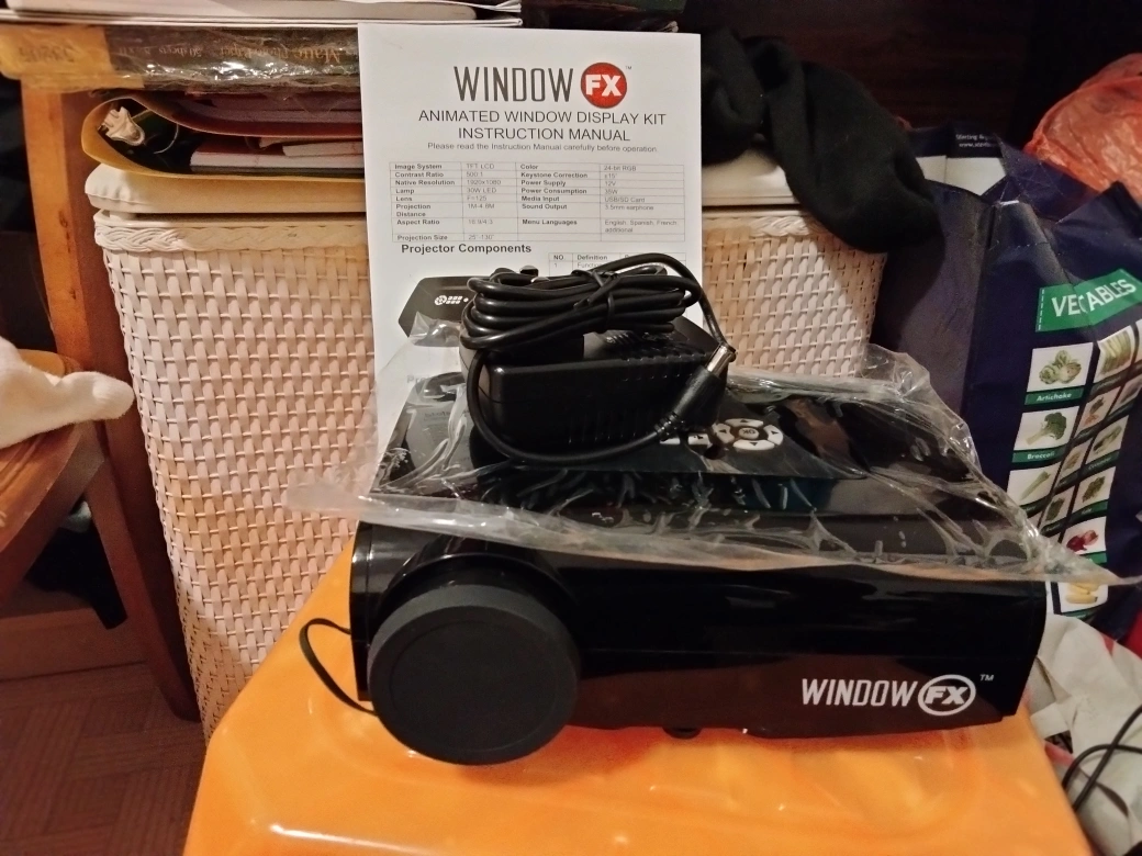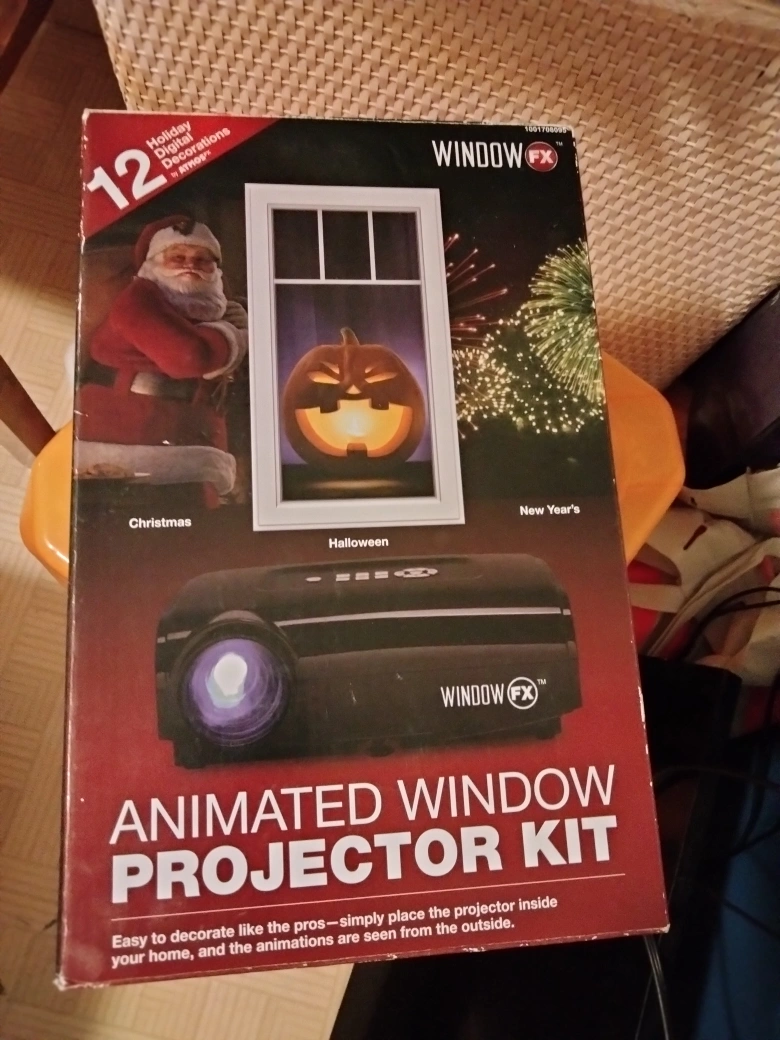 Window projector with Halloween and Christmas scenes. I bought it from Home Depot years ago for about $60. It is still like new since I rarely use it. It comes with booklet, projection screen, and SD card.