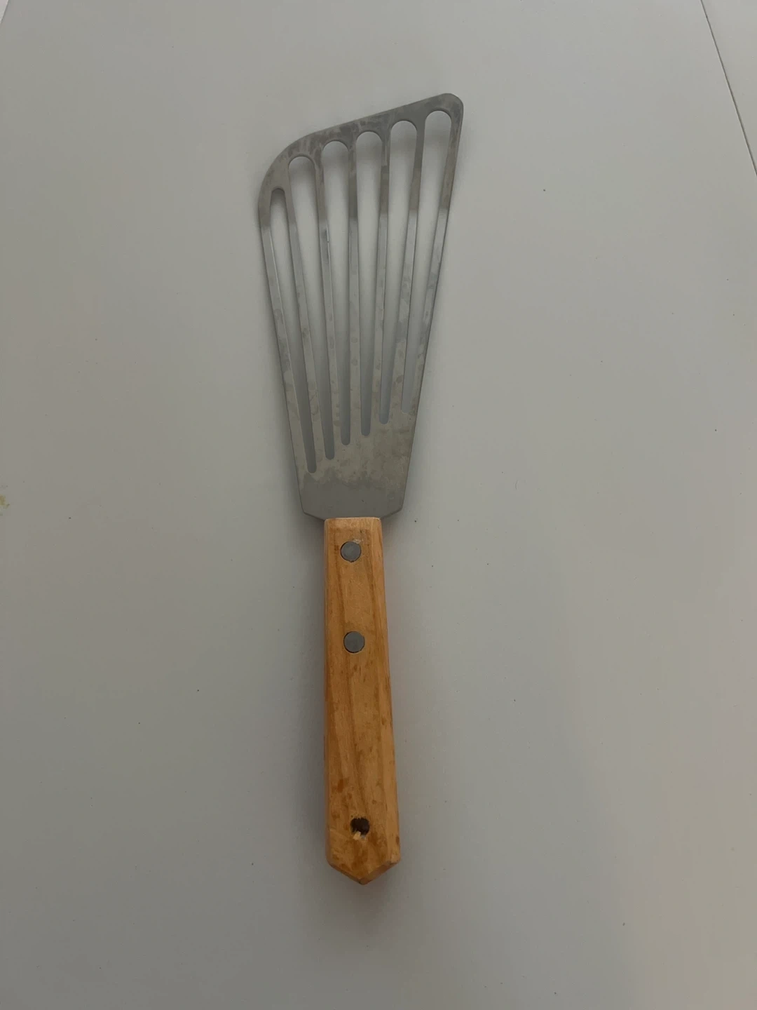 Selling a slotted turner spatula with a wooden handle. It's perfect for flipping burgers or fish! The spatula is made of metal and has a comfortable wooden handle. It's in good condition and ready for a new home